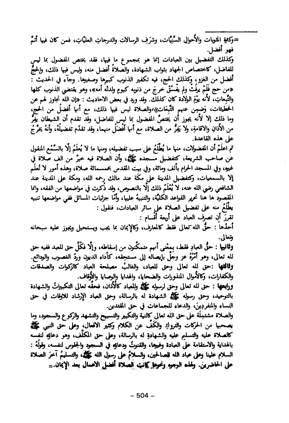 وكذلك التفضيل بين العبادات إنما هو بمجموع ما فيها، فقد يختص المفضول بما ليس للفاضل، كاختصاص الجهاد بثواب الشهادة، والصلاةُ أفضل منه، وليس فيها ذلك، والحجُّ أفضل من الغزو، وكذلك الجج، فيه تكفير الذنوب كبيرِها وصغيرها. وجاء في الحديث: "من حج فَلَم يرفث ولم يفسُق خرجَ من ذنوبه كيوم ولدتْه أمه"، وهو يقتضي الذنوب كلها والتْبعاتِ، لأنه يوْمَ الولادة كان كذلك. وقد ورد في بعض الاحاديث: "إن الله تجاوز لهم عن الخطيئات، وَضمِن عهم التْبعَات"، والصلاة ليس فيها ذلك، مع أنما أفضلُ من الحج، وما ذلك إلا لأنه يجوز أن يَختصْ المفضول بما ليس للفاضل، وقد تقدم أن الشيطان يفر من الأذانِ والاقامةِ، ولا يَفِرُّ من الصلاة، مع أنها أفْضَلُ منهما، وقد تقدّم تفضيلُهُ، وأنة يخرَّجُ على هذه القاعدة.