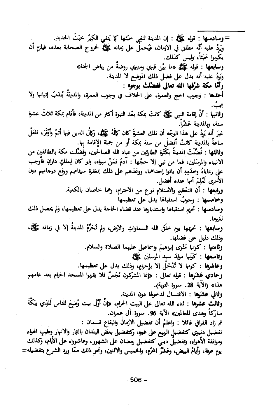 وثالثها: فُضِّلَتْ المدينةُ بكَثْرة الطارئين من عباد الله الصالحين، وفُضِّلت مكة بالطائفين من الانبياء والمرسَلين، فما من نبي إلا حجَّها: آدمُ فمَنْ سِواه، ولو كان لِملكٍ دارانِ فأوجب على رعاياهُ وخدَمِهِ أن ياتوا إحداما، ووعَدَهم على ذلك بمغفرة سيئاتهم ورفع درجاتهم دون الأخرى لَعُلِمَ أنها عنده أفضل.