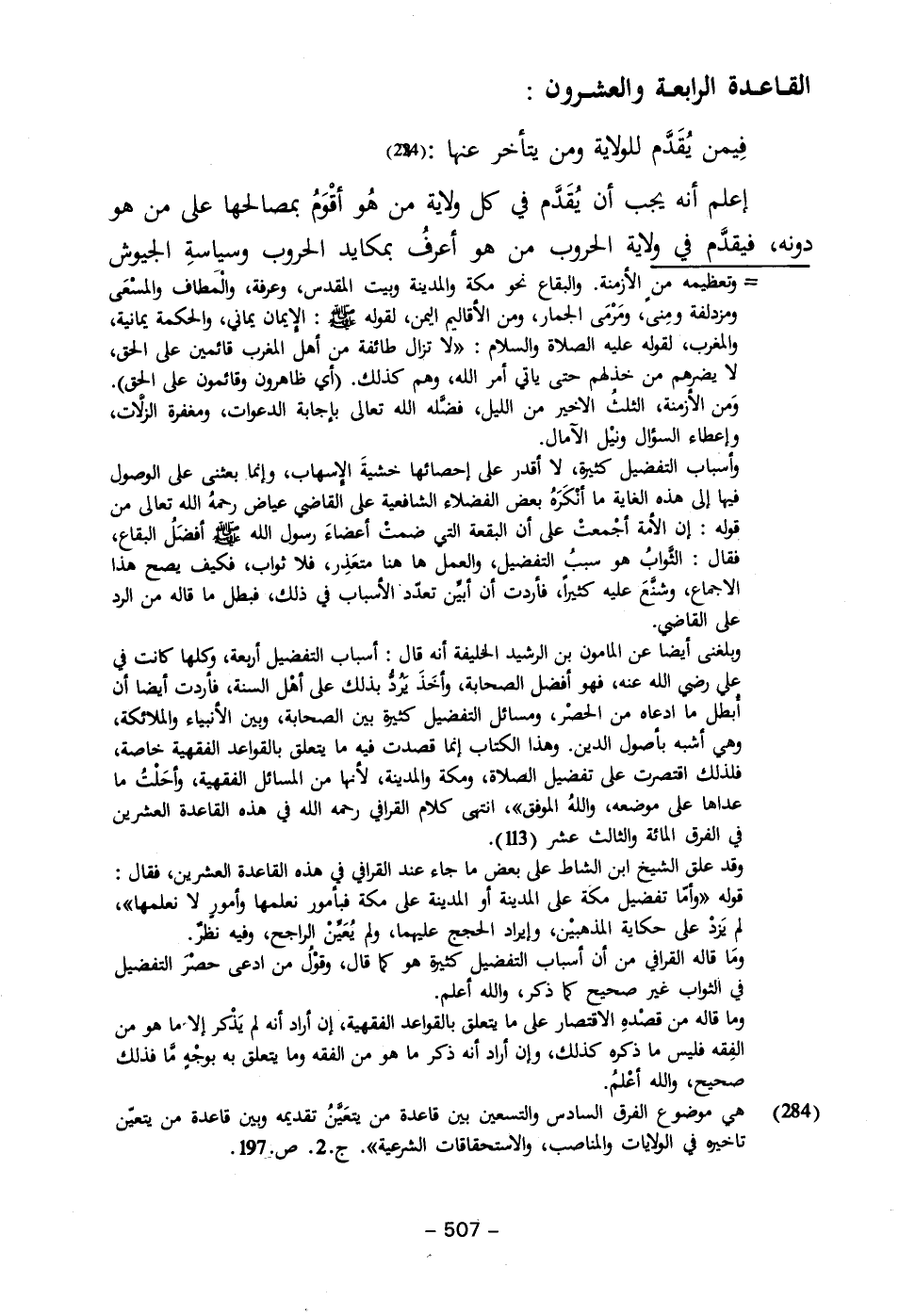 (٢٨٤) هي موضوع الفرق السادس والتسعين بين قاعدة من يتعَيَّنُ تقديمه وبين قاعدة من يتعيّن تاخيره في الولايات والمناصب، والاستحقاقات الشرعية". جـ ٢. ص.١٩٧.