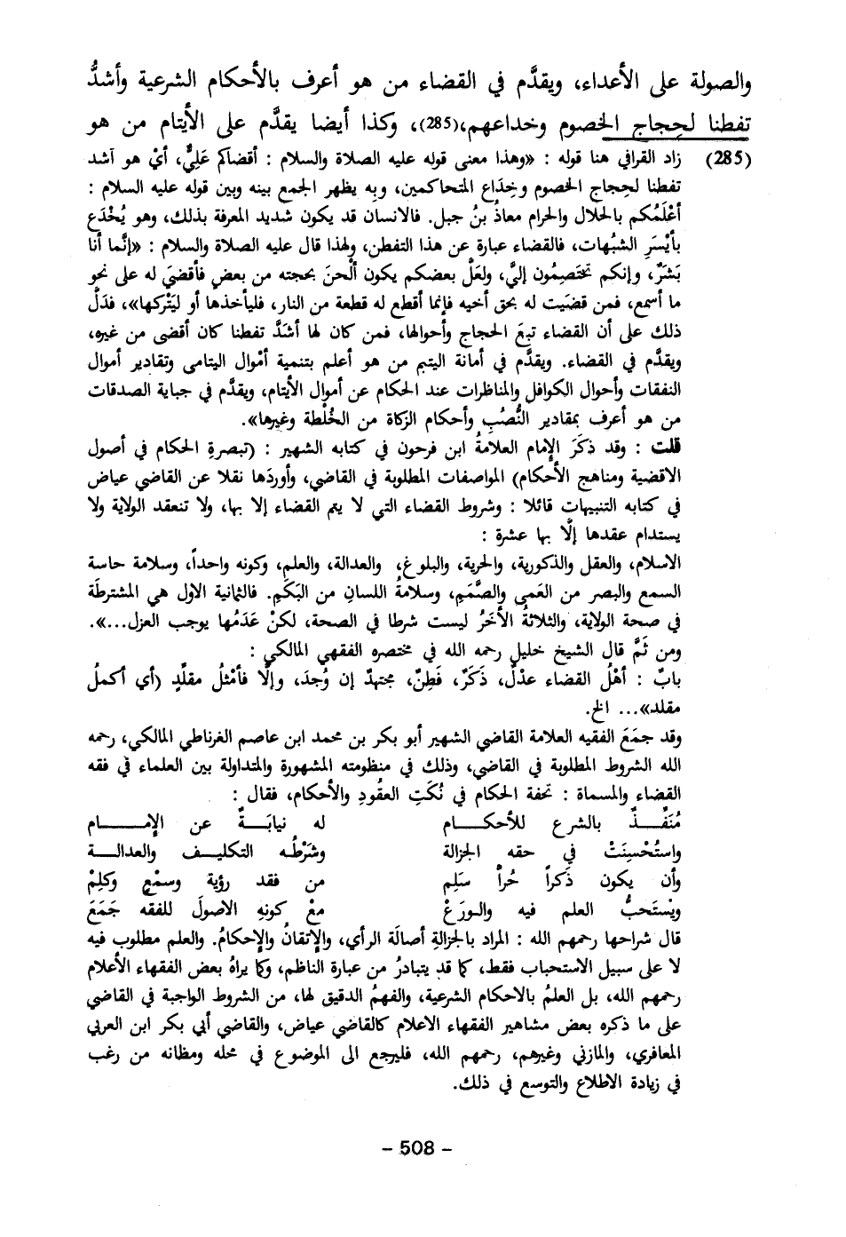 (٢٨٥) زاد القرافي هنا قوله: "وهذا معنى قوله عليه الصلاة والسلام: أقضاكم عَلِيٌّ، أيْ هو اشد تفطنا لحِجاج الخصوم وخِدَاع المتحاكمين، وبه يظهر الجمع بينه وبين قوله عليه السلام: أعلَمُكم بالحلال والحرام معاذُ بنُ جبل. فالانساَن قد يكون شديد المعرفة بذلك، وهو يُخْدَع بأيْسَرِ الشبُهات، فالقضاء عبارة عن هذا التفطن، ولهذا قال عليه الصلاة والسلام: "إنَّما أنا بَشَر، وإنكم تختَصِمُون إليَّ، ولعَلْ بعضكم كون ألْحنَ بحجته من بعضٍ فأقضيَ له على نحو ما أسمع، فمن قضَيت له بحق أخيه فإنما أقطع له قطعة من النار، فليأخذها أو ليَتْركها"، فدَلّ ذلك على أن القضاء تبعّ الحجاج وأحوالها، فمن كان لها أشَدَّ تفطنا كان أقضى من غيره، ويقدَّم في القضاء. ويقدَّم في أمانة اليتبم من هو أعلم بتنمية أمْوال اليتامى وتقادير أموال النفقات وأحوال الكوافل والمناظرات عند الحكام عن أموال الأيتام، ويقدَّم في جباية الصدقات من هو أعرف بمقادير النُّصُبِ وأحكام الزكاة من الخُلْطة وغيرها".