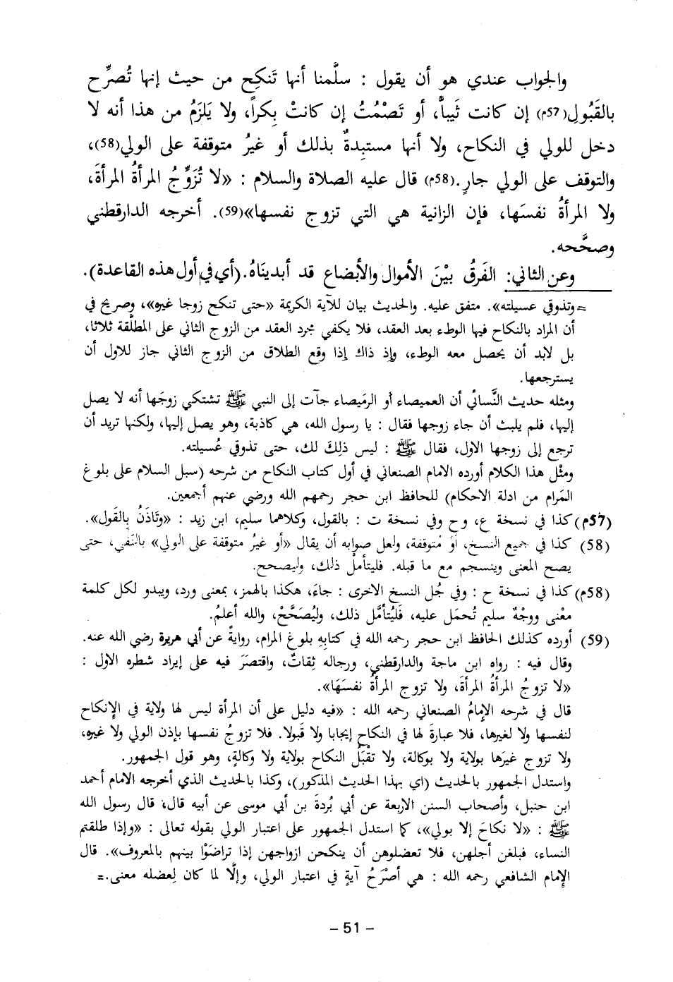 والجواب عندي هو أن يقول: سلَّمنا أنها تَنكِح من حيث إنها تُصرِّح بالقَبُولِ (٥٧ م) إن كانت ثَيبًّا، أو تَصْمُتُ إن كانتْ بِكرًا، ولا يَلزَمُ من هذا أنه لا دخل للولي في النكاح، ولا أنها مستبِدةٌ بذلك أو غيرُ متوقفة على الولي (٥٨)، والتوقف على الولي جارٍ. (٥٨ م) قال عليه الصلاة والسلام: "لا تُزوِّجُ المرأةُ المرأةَ، ولا المرأةُ نفسَها، فإن الزانية هي التي تزوج نفسها" (٥٩). أخرجه الدارقطني وصحَّحه.