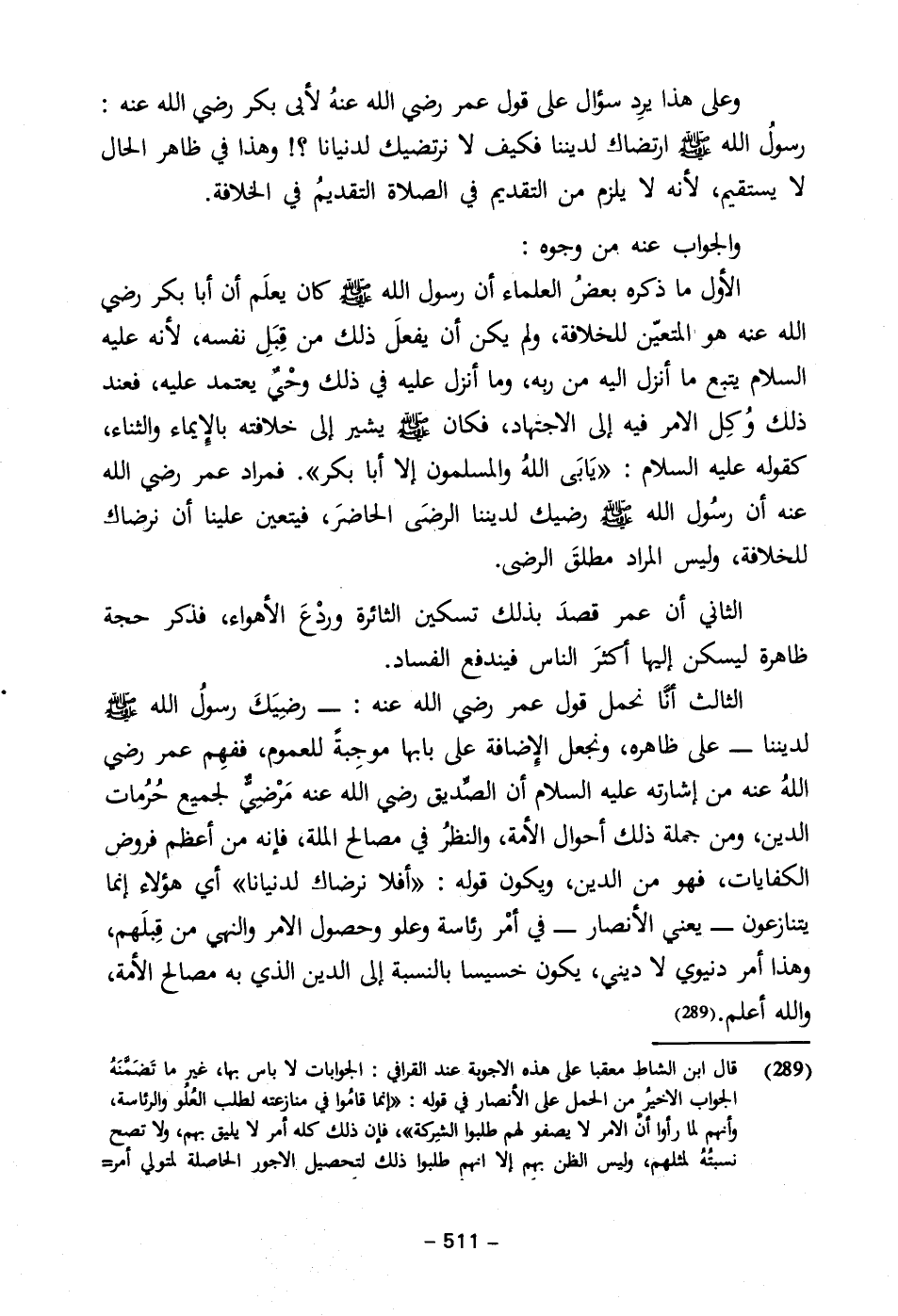 الثالث أنَّا نحمل قول عمر رضي الله عنه: - رضِيَكَ رسولُ الله - صلى الله عليه وسلم - لديننا - على ظاهره، ونجعل الإضافة على بابها موجِبةً للعموم، ففهِم عمر رضي اللهُ عنه من إشارته عليه السلام أن الصِّديق رضي الله عنه مَرضيٌّ لجميع حُرُمات الدين، ومن جملة ذلك أحوال الأمة، والنظرُ في مصالح الملة، فإنه من أعظم فروض الكفايات، فهو من الدين، ويكون قوله: "أفلا نرضاك لدنيانا" أي هؤلاء إنما يتنازعون - يعني الأنصار - في أمر رئاسة وعلو وحصول الامر والنهي من قِبلَهم، وهذا أمر دنيوي لا ديني، يكون خسيسا بالنسبة إلى الدين الذي به مصالح الأمة، والله أعلم. (٢٨٩)
