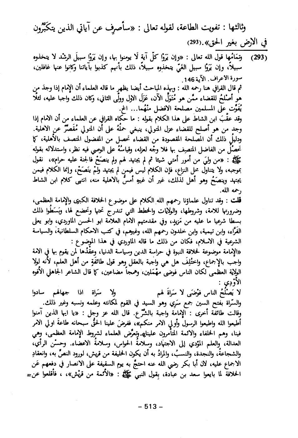 وقالت طائفة أخرى: الإمامة واجبة بالشّرع. قال الله عز وجل: {يَاأَيُّهَا الَّذِينَ آمَنُوا أَطِيعُوا اللَّهَ وَأَطِيعُوا الرَّسُولَ وَأُولِي الْأَمْرِ مِنْكُمْ}، ففرضَ علينا الحق سبحانه طاعةَ اولي الامر فينا، وهم الحلفاء والائمة المتأمرون علينا". وتعرَّض العلماء لشروط الإمامة العظمى، وهي العدالة، والعلم المؤدى إلى الاجتهاد، وسلامةُ الحواس، وسلامةُ الاعضاء. وحسْن الرأي، والشجاعةُ، والنجدة، والنسبُ، والمرادُ به أن يكون الخليفة من قريش، لورود النصٌ به، وانعقادِ الاجماع عليه، لأن أبا بكر رضي الله عنه احتج به يوم السقيفة على الانصار في دفعهم عَن الخلافة لما بايعوا سعد بن عبادة، بِقول النبي - صلى الله عليه وسلم -: "الأئمة من قريْش"، ، فأقلعوا عن =
