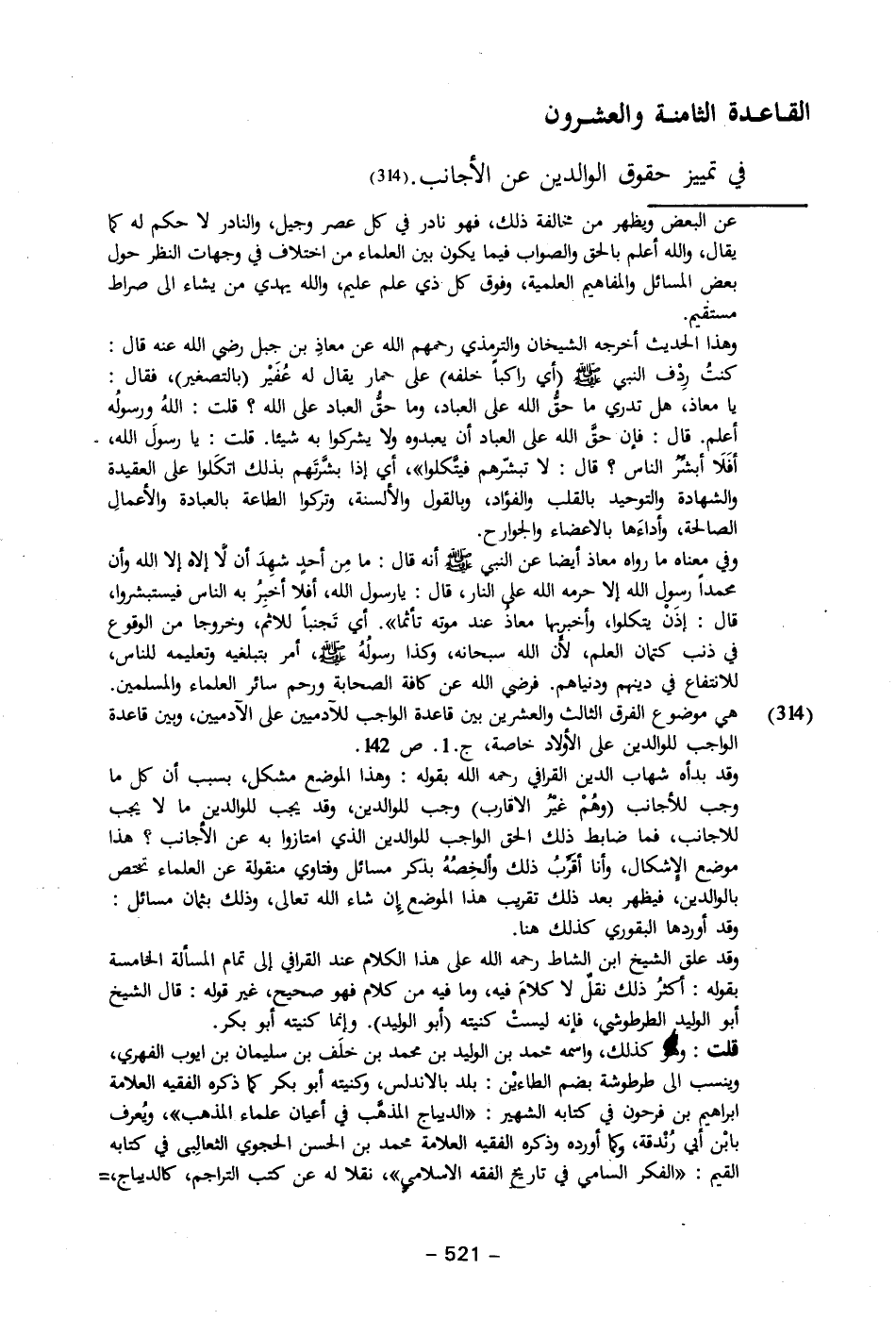 (٣١٤) هي موضوع الفرق الثالث والعشرين بين قاعدة الواجب للآدميين على الآدميين، وبين قاعدة الواجب للوالدين على الأولاد خاصة، جـ ١. ص ١٤٢.