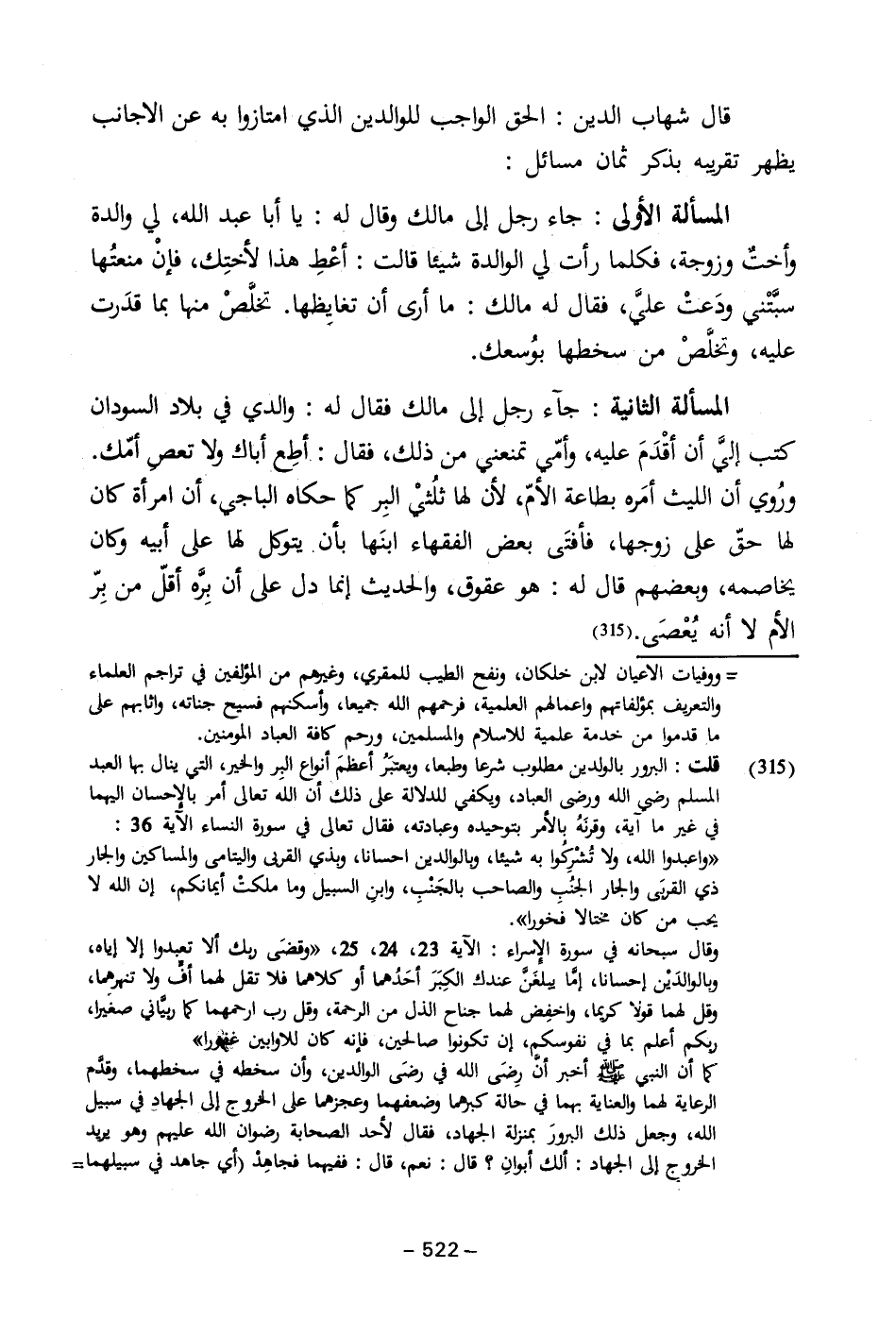 قال شهاب الدين: الحق الواجب للوالدين الذي امتازوا به عن الاجانب يظهر تقريبه بذكر ثمان مسائل: