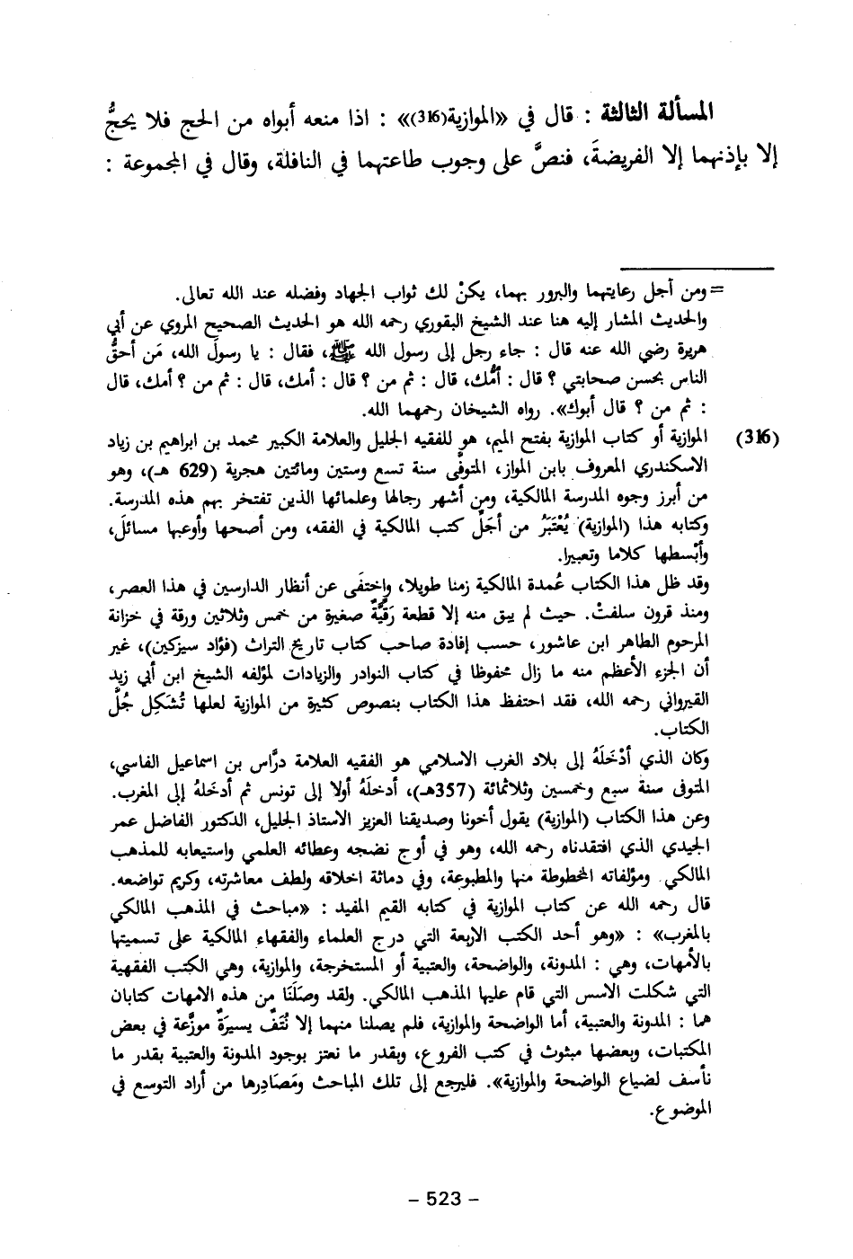 (٣١٦) الموازية أو كتاب الموارية بفتح الميم، هو للففيه الجليل والعلامة الكبير محمد بن ابراهيم بن زياد الاسكندري المعروف بابن المواز، المتوفَّى سنة تسع وستين ومائتين هجرية (٦٢٩ هـ)، وهو من أبرز وجوه المدرسة المالكية، وفي أشهر رجالها وعلمائها الذين تفتخر بهم هذه المدرسة. وكتابه هذا (الموازية) يعتَبَرُ من أجَل كتب المالكية في الفقه، ومن أصحها وأوعبها مسائلَ، وأبْسطها كلاما وتعبيرا. وقد ظل هذا الكتاب عُمدة المالكية زمنا طويلا، واختفَى عن أنظار الدارسين في هذا العصر، ومنذ قرون سلفتْ. حيث لم يبِق منه إلا قطعة رَقية صغيرة من خمس وثلاثين ورقة في خزانة المرحوم الطاهر ابن عاشور، حسب إفادة صاحب كتاب تاريخ التراث (فؤاد سيزكين)، غير أن الجزء الأعظم منه ما زال محفوظا في كتاب النوادر والزيادات لمؤْلفه الشيخ ابن أبي زيد القيرواني رحمه الله، فقد احتفظ هذا الكتاب بنصوص كثيرة من الموازية لعلها تُشَكِل جُلَّ الكتاب.