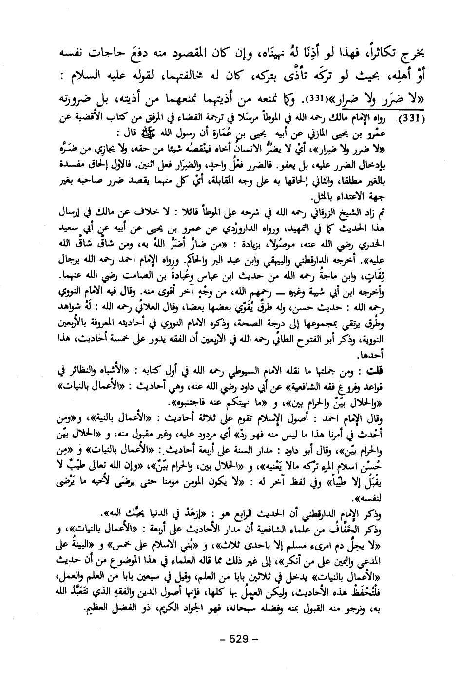 ثم زاد الشيخ الزرقاني رحمه الله في شرحه على الموطأ قائلا: لا خلاف عن مالك في إرسال هذا الحديث كما في التمهيد، ورواه الداروري عن عمرو بن يحيى عن أبيه في أبي سعيد الخدرى رضي الله عنه، موصُولا، بزيادة: "من ضارَّ أضَرَّ اللهُ به، ومن شاقَّ شاقَّ الله عليه". أخرجه الدارقطني والبيهقي وابن عبد البر والحاكم. ورواه الإِمام احمد رحمه الله برجال ثِقَاتٍ، وابن ماجةُ رحمه الله من حديث ابن عباس وعُبادةَ بن الصامت رضي الله عنهما. وأخرجه ابن أبي شبية وغيره رحمهمِ الله، من وجه آخر أقوى منه. وقال فيه الامام النووي رحمه الله: حديث حسن، وله طرق يُقوي بعضها بعضا، وقال العلائي رحمه الله: لَهُ شواهد وطُرق يرتقى بمجموعها إلى درجة الصحة، وذكره الامام النووي في أحاديثه المعروفة بالأربعين النووية، وذكر أبو الفتوح الطائي رحمه الله في الاربعين أن الفقه يدور على خمسة أحاديث، هذا أحدها.