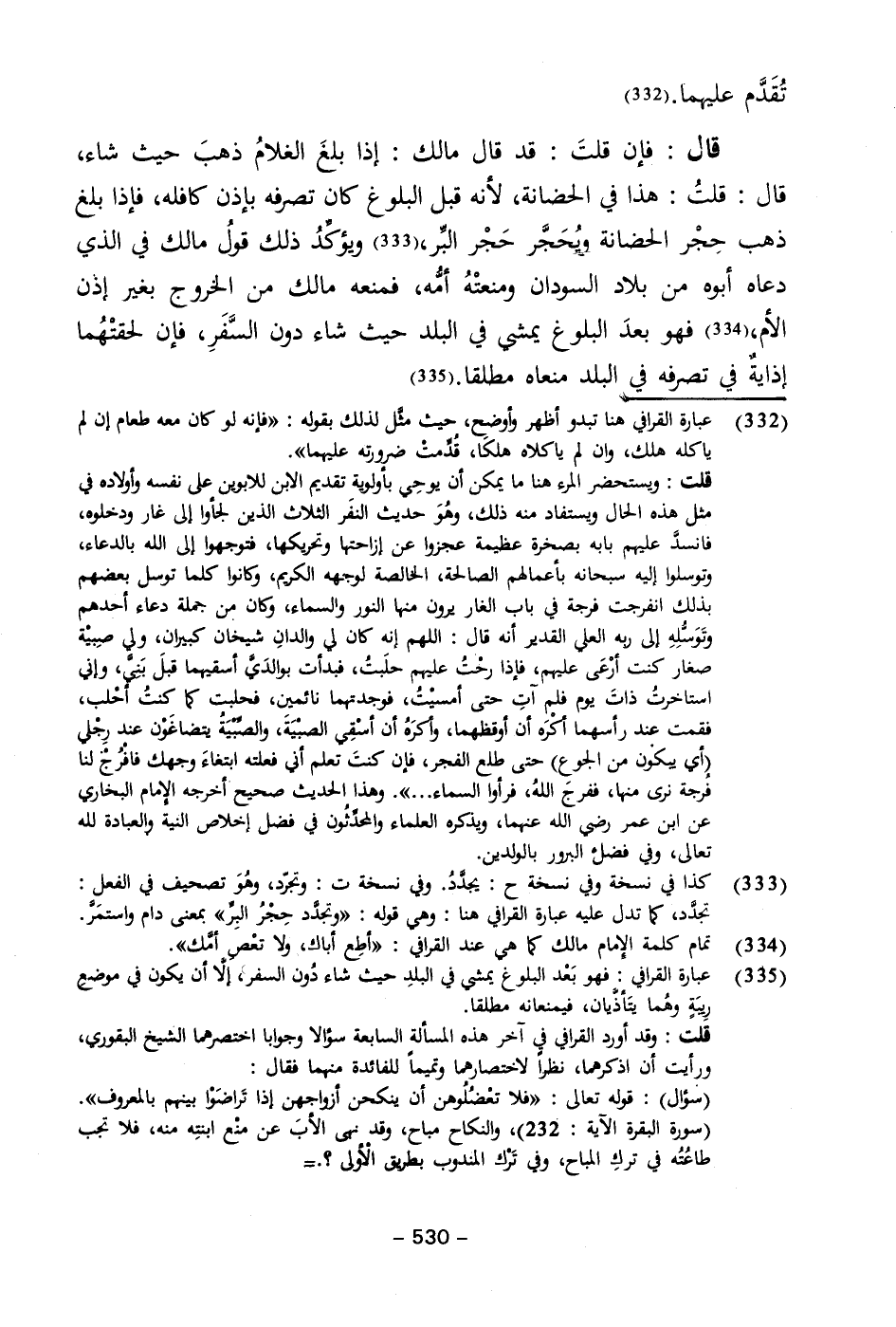 (٣٣٥) عبارة القرافي: فهو بَغد البلوغ يمشي في البلدِ حيث شاء دُون السفر, إلَّا أن يكون في ربيةٍ وهُما يتَأذيان، فيمنعانه مطقا.