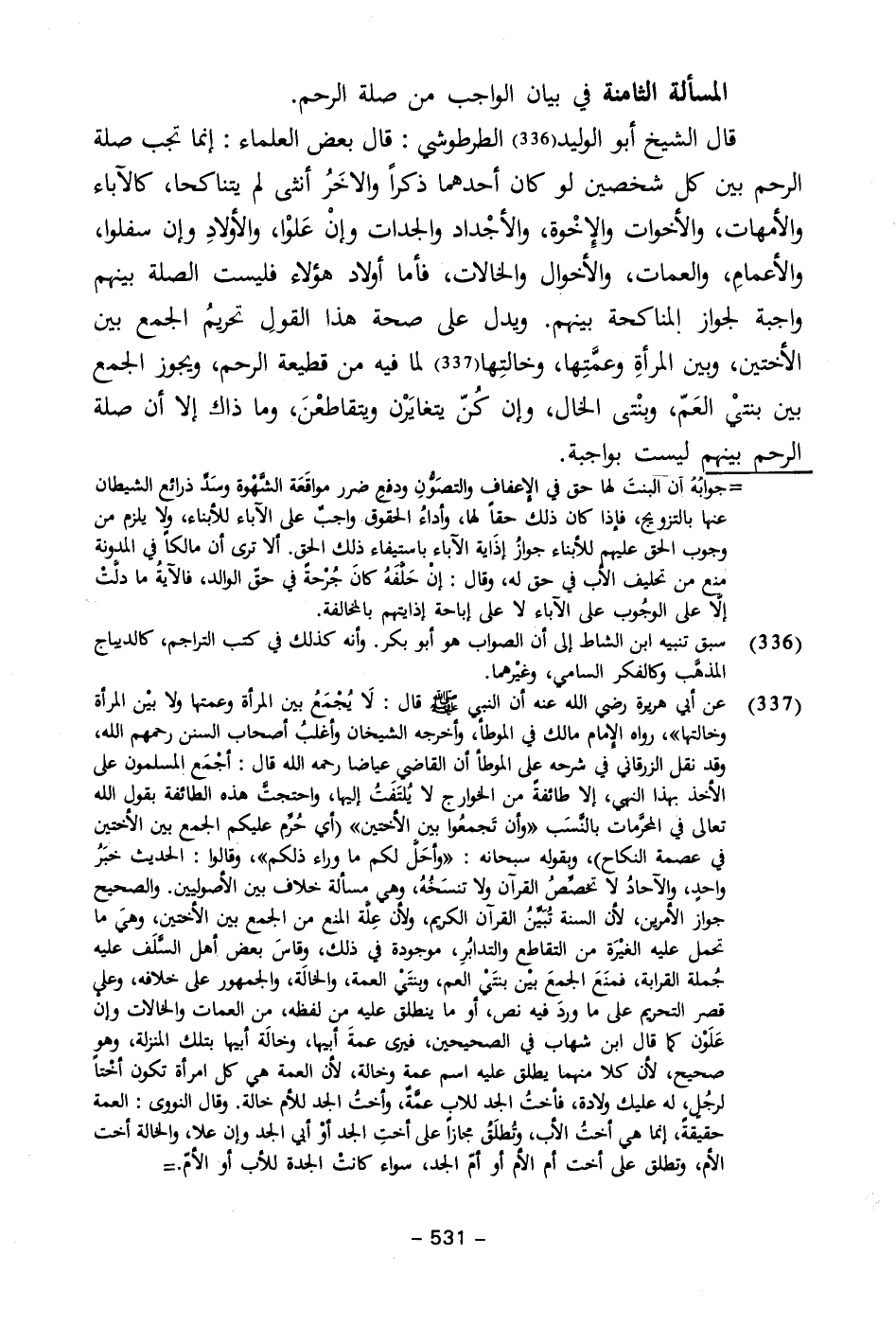 قال الشيخ أبو الوليد (٣٣٦) الطرطوشي: قال بعض العلماء: إنما تجب صلة الرحم بين كل شخصين لو كان أحدهما ذكراً والاخَرُ أنثى لم يتناكحا، كالآباء والأمهات، والأخوات والِإخْوة، والأجْداد والجدات وإنْ عَلوْا، والأولادِ وإن سفلوا، والأعمامِ، والعمات، والأخوال والخالات، فأما أولاد هؤلاء فليست الصلة بينهم واجبة لجواز المناكحة بينهم. ويدل على صحة هذا القولِ تحريمُ الجمع بين الأختين، وبين المرأةِ وعمَّتِها، وخالتِها (٣٣٧) لما فيه من قطيعة الرحم، ويجوز الجمع بين بنتي العَمّ، وبنْتي الخال، وإن كُنّ يتغايَرْن ويتقاطعْنَ، وما ذاك إلا أن صلة الرحم بينهم ليست بواجبة.