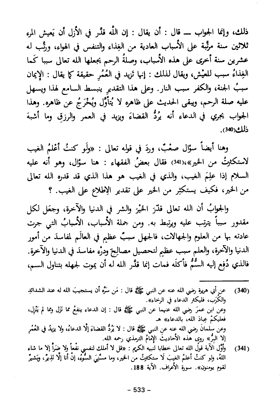 ذلك، وإنما الجواب - قال: أن يقال: ان الله قدَّر في الأزل أن يَعيش المرء ثلاثين سنة مرتَّبة على الأسباب العادية من الغِذاء والتنفس في الهواء، ورتَّب له عشرين سنة أخرى على هذه الأسباب، وصلةُ الرحم يجعلها الله تعالى سببا كَما الغِذاءُ سبب للعيْش، ويقال لذلك: إنها تَزيد في العُمُرِ حقيقة كما يقال: الإيمان سببُ الجنة، والكفر سبب النار. وعلى هذا التقديرِ ينبسط السامع لهذا ويسهل عليه صلة الرحم، ويبقى الحديث على ظاهره لا يُتأوَّل ويُخْرَجُ عن ظاهره. وهذا الجواب يجري في الدعاء أنه يرُدُّ القضاءَ ويزيد في العمر والرزقِ وما أشبهَ ذلك (٣٤٠).