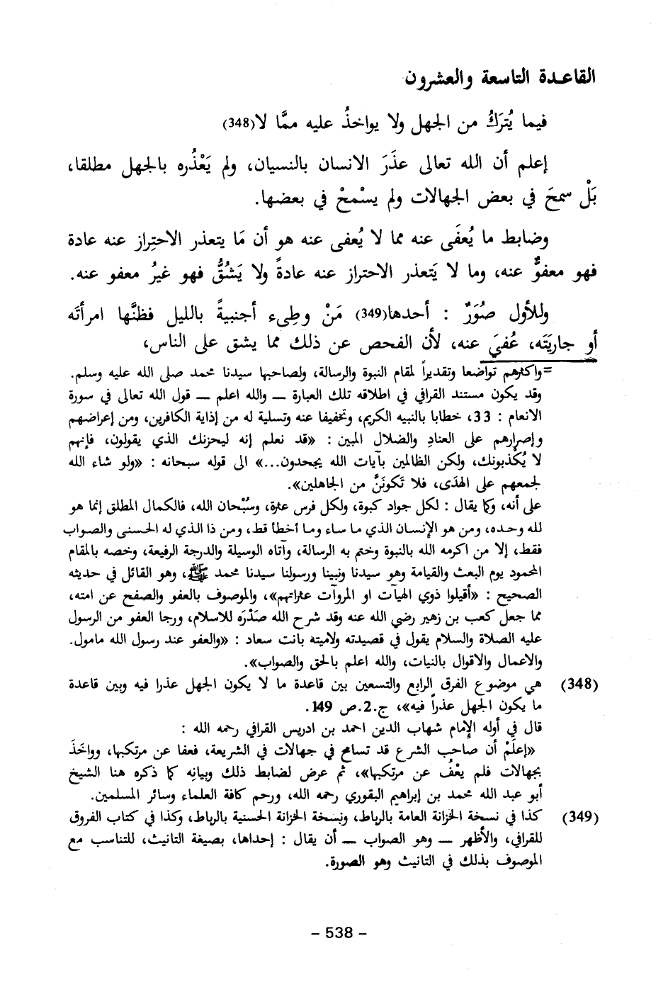 (٣٤٨) هي موضوع الفرق الرابع والتسعين بين قاعدة ما لا يكون الجهل عذرا فيه وبين قاعدة ما يكون الجهل عذراً فيه"، جـ ٢. ص ١٤٩.