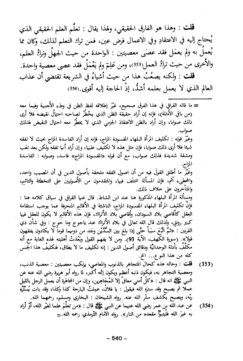 قلت: وهذا هو الفارق الحقيقي، ولهذا يقال: تعلّم العلم الحقيقي الذي يُحتاج إليه في الاعتقادِ وفي الاعمال فرض عين، فمن ترك التعلم لذلك، وكان مما يُعملُ به ولم يعمَل فقد عصى معصيتين: الواحدة من حيث الجهلُ وتركُ العلم، والأخرى من حيث تركُ العمل (٣٥٣)، ومن علِم ولم يعمَلْ فقد عصى معصية واحدة.