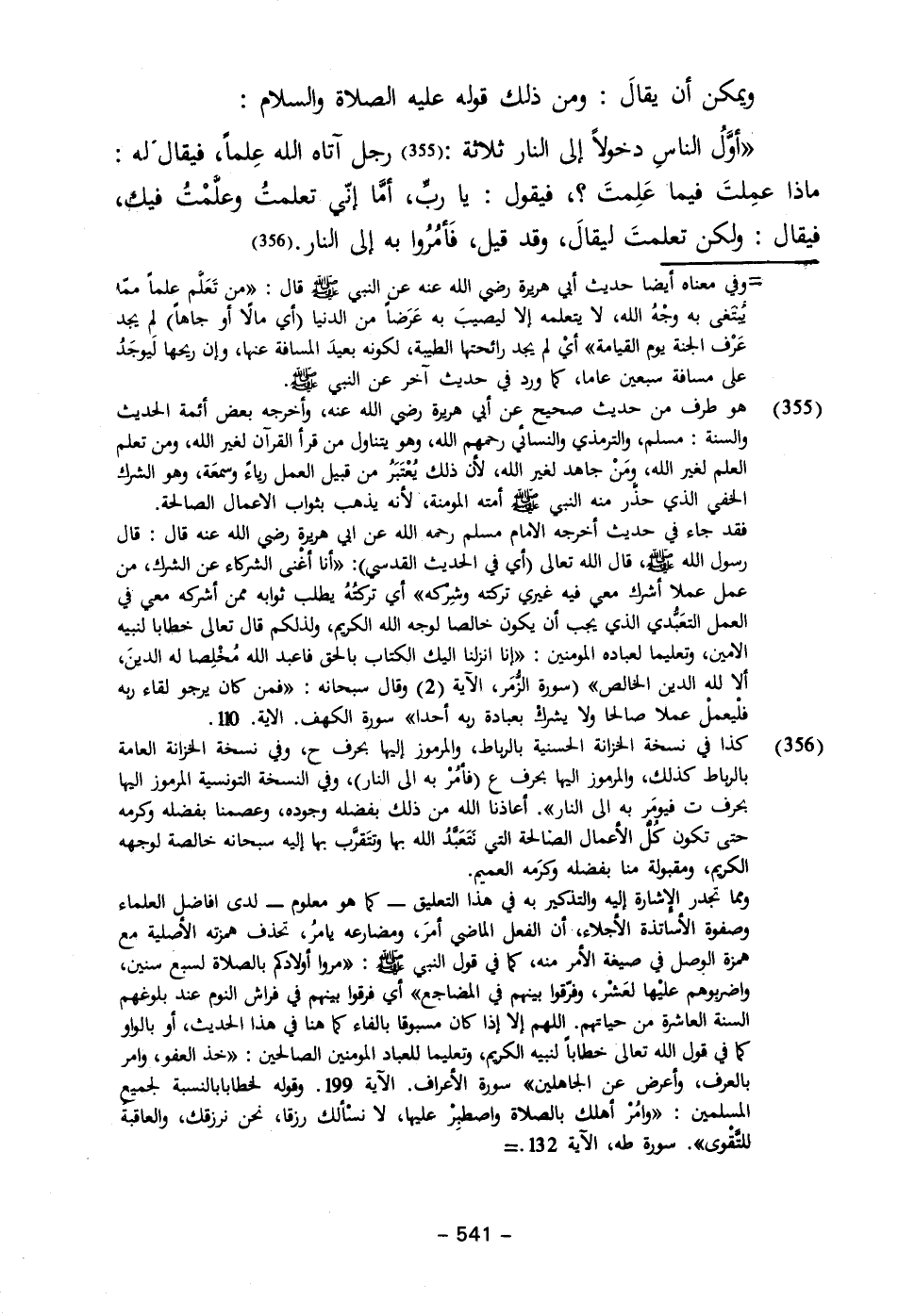 "أوَّلُ الناسِ دخولاً إلى النار ثلاثة: (٣٥٥) رجل آتاه الله عِلماً، فيقال له: ماذا عمِلتَ فيما عَلِمتَ؟ ، فيقول: يا ربِّ، أمَّا إني تعلمتُ وعلَّمْتُ فيك، فيقال: ولكن تعلمتَ ليقالَ، وقد قيل، فَأمُرُوا به إلى النار. (٣٥٦)