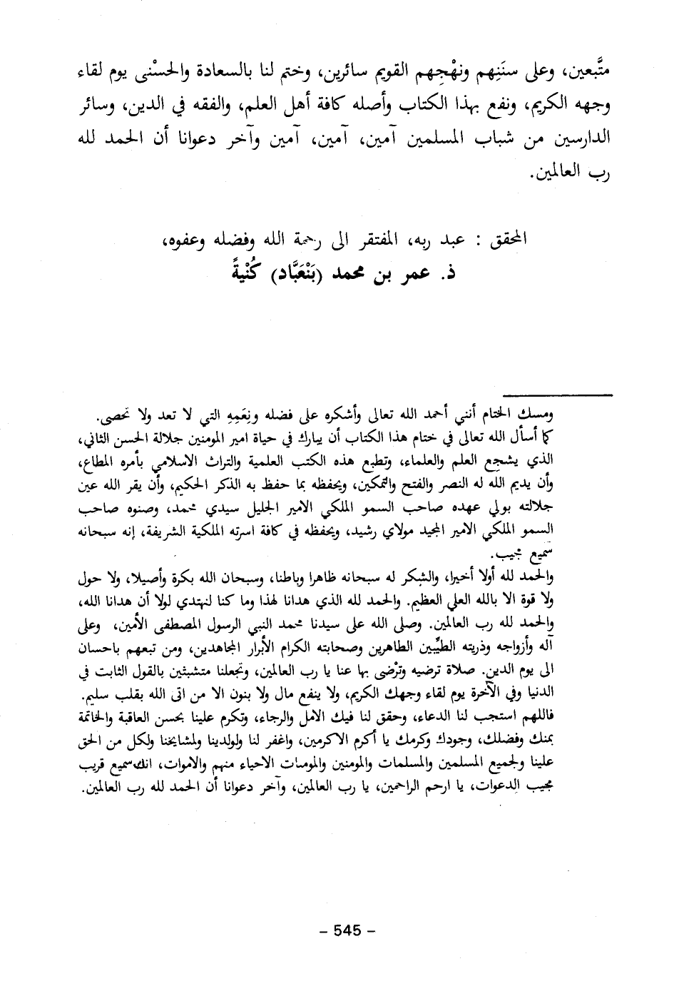 ومسك الختام أنني أحمد الله تعالى وأشكره على فضله ونِعَمِهِ التي لا تعد ولا تحصى. كما أسأل الله تعالى في ختام هذا الكتاب أن يبارك في حياة امير المومنين جلالة الحسن الثاني، الذي يشجع العلم والعلماء، وتطبع هذه الكتب العلمية والتراث الاسلامي بأمره المطاع، وأن يديم اللَه له النصر والفتح والتمكين، ويحفظه بما حفظ به الذكر الحكيم، وأن يقر الله عين جلالته بولي عهده صاحب السمو الملكي الامير الجليل سيدي محمد، وصنوه صاحب السمو الملكي الامير المجيد مولاي رشيد، ويحفظه في كافة اسرته الملكية الشريفة، إنه سبحانه سميع مجيب.