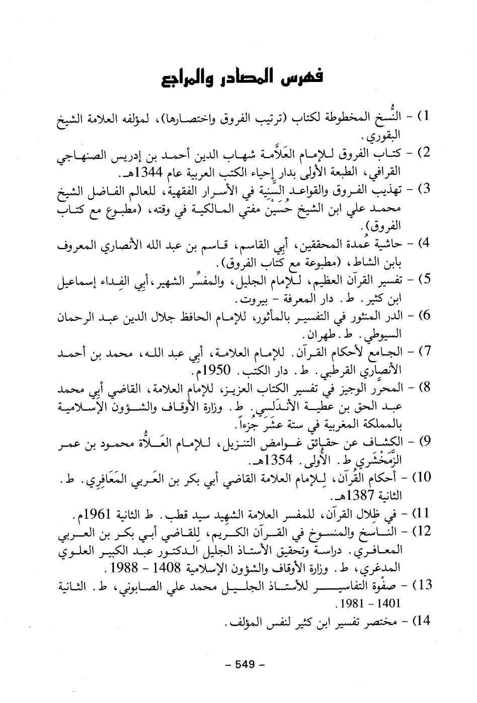 ٢ - كتاب الفروق للإِمام العَلاَّمة شهاب الدين أحمد بن إدريس الصنهاجي القرافي، الطبعة الأولى بدار إحياء الكتب العربية عام ١٣٤٤ هـ.