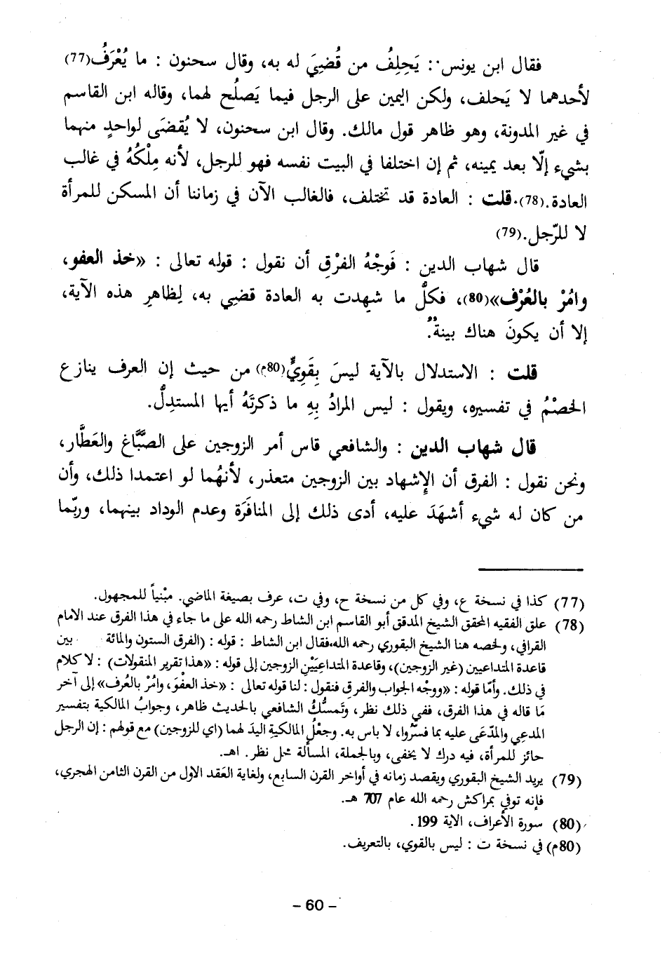 (٧٨) علق الفقيه المحقق الشيخ المدقق أبو القاسم ابن الشاط رحمه الله على ما جاء في هذا الفرق عند الإِمام القرافي، ولخصه هنا الشيخ البقوري رحمه الله، فقال ابن الشاط: قوله: (الفرق الستون والمائة بين قاعدة المتداعيين (غير الزوجين)، وقاعدة المتداعِيَيْن الزوجين إلى قوله: "هذا تقرير المنقولات): لا كلام في ذلك. وأمّا قوله: "ووجْه الجواب والفرق فنقول: لنا قوله تعالى: {خُذِ الْعَفْوَ وَأْمُرْ بِالْعُرْفِ} إلى آخر ما قاله في هذا الفرق، ففي ذلك نظر، وتَمسُّكُ الشافعي بالحديث ظاهر، وجواب المالكية بتفسير المدعي والمدّعى عليه بما فسَّرُوا، لا بأس به. وجعْلُ المالكية اليدُ لهما (اي للزوجين) مع قولهم: إن الرجل حائز للمرأة، فيه درك لا يخفي، وبالجملة، المسألة محل نظر. اهـ.
