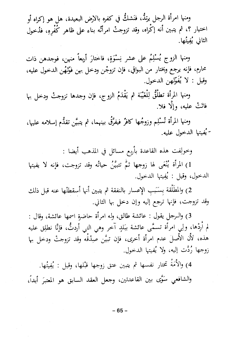 ومنها المرأة تُسلم وزوجُها كافرٌ فيفرَّقُ بينهما، ثم يتبين تقدُّم إسلامه عليها، يُفيتها الدخول عليه.