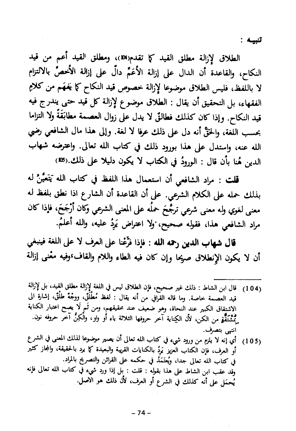 الطلاق لإزالة مطلق القيد كما تقدم (١٠٤)، ومطلق القيد أعم من قيد النكاح، والقاعدة أن الدال على إزالة الأعَمِّ دالٌ على إزالة الأخصِّ بالالتزام لا باللفظ، فليس الطلاق موضوعا لإزالة خصوص قيد النكاح كما يُفهَم من كلامِ الفقهاء، بل التحقيق أن يقال: الطلاق موضوع لإزالة كل قيد حتى يندرج فيه قيد النكاح. وإذا كان كذلك فطالقٌ لا يدل على زوال العصمة مطابَقَةً ولا التزاما بحسب اللغة، والحقُّ أنه دل على ذلك عرفا لا لغة. والى هذا مال الشافعي رضى الله عنه، واستدل على هذا بورود ذلك في كتاب الله تعالى. واعترضه شهاب الدين هُنا بأن قال: الورودُ في الكلناب لا يكون دليلا على ذلك. (١٠٥)