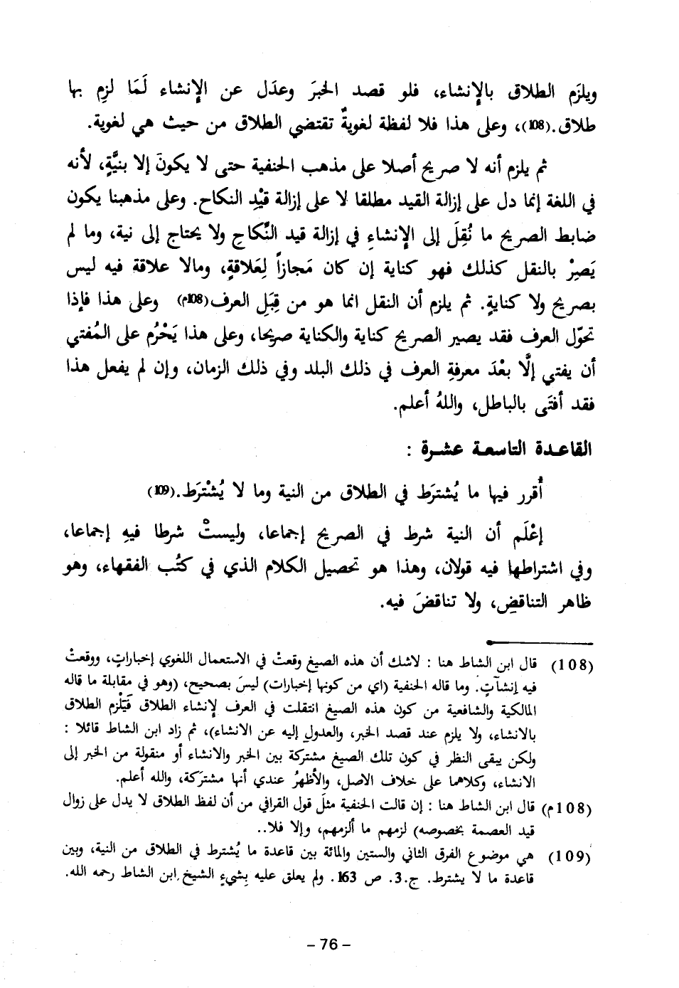 (١٠٩) هي موضوع الفرق الثاني والستين والمائة بين قاعدة ما يُشترط في الطلاق من النية، وبين قاعدة ما لا يشترط. جـ ٣. ص ١٦٣. ولم يعلق عليه بشيءٍ الشيخ ابن الشاط رحمه الله.