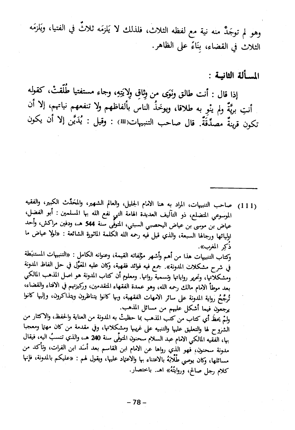 (١١١) صاحب التنبيهات، المراد به هنا الإِمام الجليل، والعالم الشهير، والمحَدِّث الكبير، والفقيه الموسوعي المتضلع، ذو التآليف العديدة الهامة التي نفع الله بها المسلمين: أبو الفضل، عياض بن موسى بن عياض اليحصبي السبتي، المتوفى سنة ٥٤٤ هـ، ودفين مراكش، وأحد أوليائها ورجالها السبعة، والذي قيل نيه رحمه الله الكلمة الماثورة الشائعة: "لولا عياض ما ذُكِر المغرب".