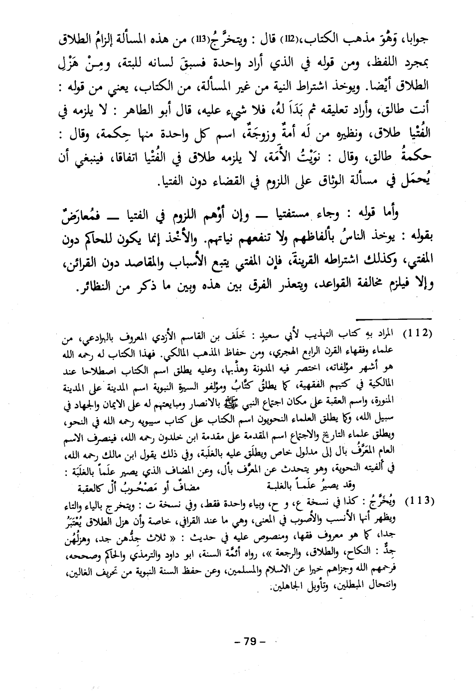 (١١٣) وُيخَرَّجُ: كذا في نسخة ع، وح، وبياء واحدة فقط، وفي نسخة ت: ويتخرج بالياء والتاء ويظهر أنها الأنسب والأصوب في المعنى، وهي ما عند القرافي، خاصة وأن هزل الطلاق يُعْتَبَرُ جدا، كما هو معروف فقها، ومنصوص عليه في حديث: "ثلاث جِدُّهن جد، وهزلُهُن جِدٌّ: النكاح، والطلاق، والرجعة"، رواه أئمة السنة، أبو داود والترمذي والحاكم وصححه، فرحمهم الله وجزاهم خيرا عن الإسلام والمسلمين، وعن حفظ السنة النبوية من تحريف الغالين، وانتحال المبطلين، وتأويل الجاهلين.