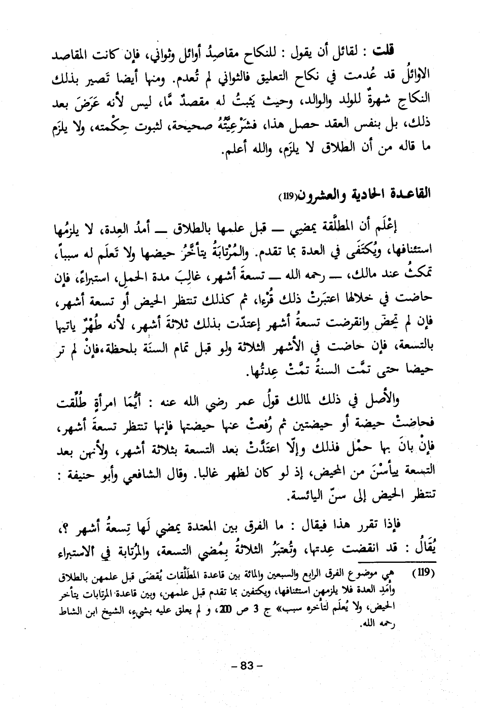 (١١٩) هي موضوع الفرق الرابع والسبعين والمائة بين قاعدة المطلقات يُقضَى قبل علمهن بالطلاق وأمَدِ العدة فلا يلزمهن استئنافها، ويكتفين بما تقدم قبل علمهن، وبين قاعدة المرتابات يتأخر الحيض، ولا يُعلم لتأَخره سبب" جـ ٣ ص ٢٠٠، ولم يعلق عليه بشيءٍ، الشيخ ابن الشاط رحمه الله.