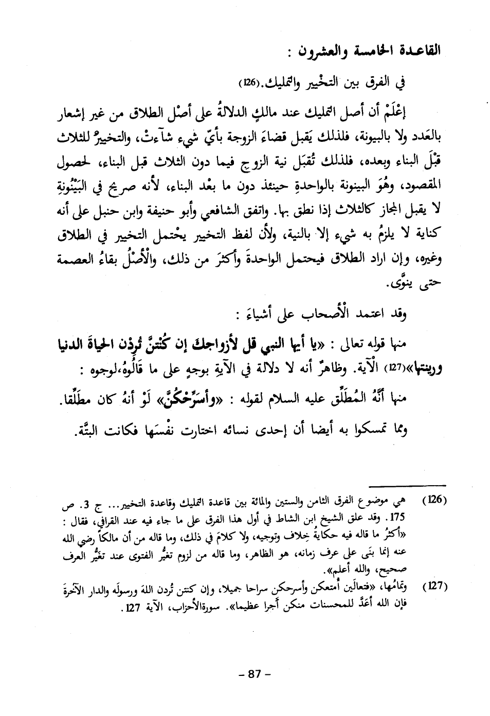 (١٢٦) هي موضوع الفرق الثامن والستين والمائة بين قاعدة التمليك وقاعدة التخيير ... جـ ٣. ص ١٧٥. وقد علق الشيخ ابن الشاط في أول هذا الفرق على ما جاء فيه عند القرافي، فقال: "أكثر ما قاله فيه حكايةً خلاف وتوجيه، ولا كلامَ في ذلك، وما قاله من أن مالكًا رضي الله عنه إنما بنَى علي عرف زمانه، هو الظاهر، وما قاله من لزوم تغيُّر الفتوى عند تغيُّر العرف - صحيح، والله أعلم".