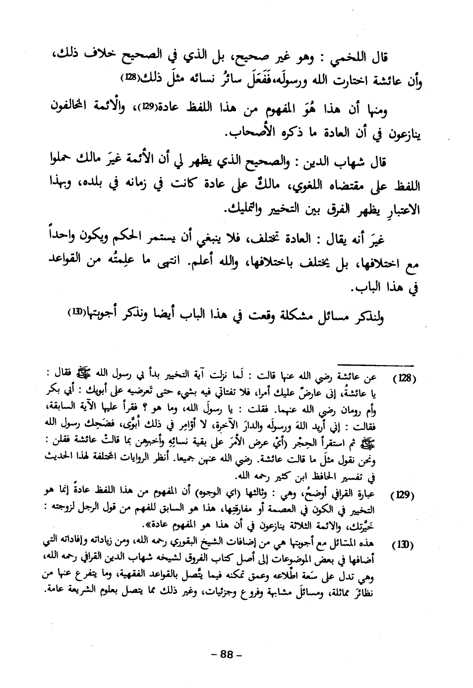 (١٢٩) عبارة القرافي أوضحُ، وهي: وثالثها (أي الوجوه) أن المفهوم من هذا اللفظ عادةً إنما هو التخيير في الكون في العصمة أو مفارقِتها، هذا هو السابق للفهم من قول الرجل لزوجته: "خَيَّرتك، والائمة الثلاثة ينازعون في أن هذا هو المفهوم عادة".