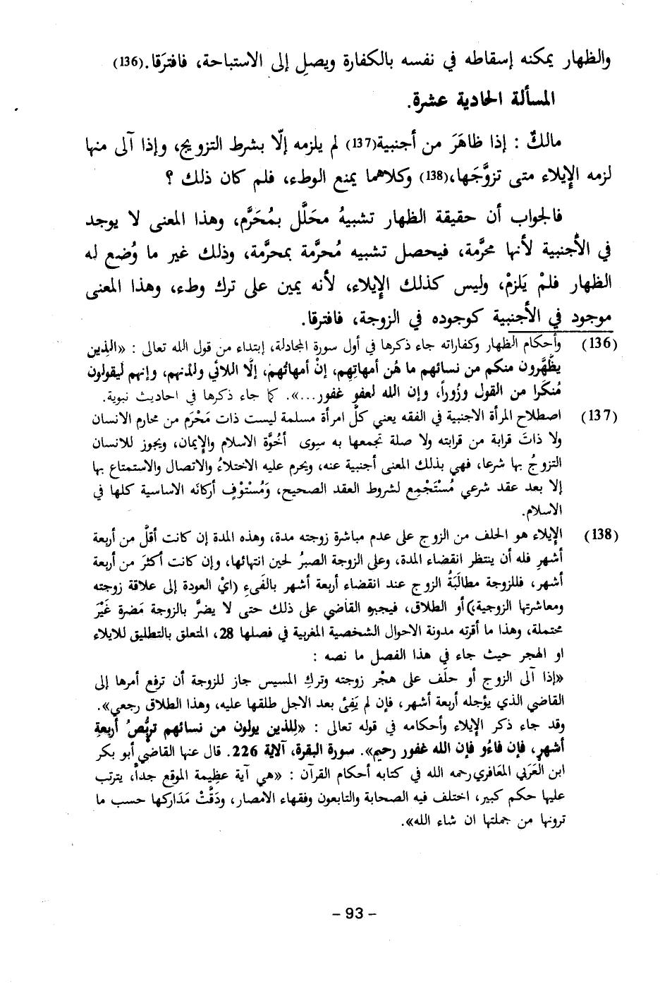 (١٣٨) الإيلاء هو الحلف من الزوج على عدم مباشرة زوجته مدة، وهذه المدة إن كانت أقلَّ من أربعة أشهر فله أن ينتظر انقضاء المدة، وعلى الزوجة الصبرُ لحين انتهائها، وإن كانت أكثرَ من أربعة أشهر، فللزوجة مطالَبَةُ الزوج عند انقضاء أربعة أشهر بالفَئ (ايْ العودة إلى علاقة زوجته ومعاشرتها الزوجية) أو الطلاق، فيجبره القاضي على ذلك حتى لا يضرَّ بالزوجة مَضرة غَيْرَ محتملة، وهذا ما أقرته مدونة الاحوال الشخصية المغربية في فصلها ٢٨، المتعلق بالتطليق للايلاء أو الهجر حيث جاء في هذا الفصل ما نصه: