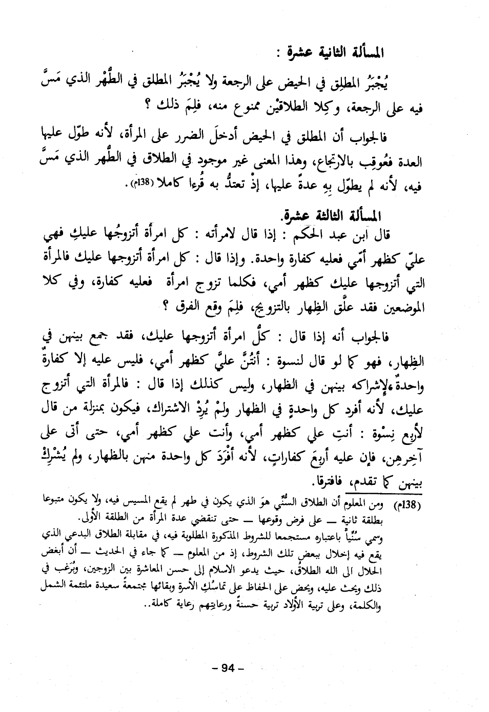 (١٣٨ م) ومن المعلوم أن الطلاق السُّنِّي هو الذي يكون في طهر لم يقع المسيس فيه، ولا يكون متبوعا بطلقة ثانية - على فرض وقوعها - حتى تنقضي عدة المرأة من الطلقة الأولى.