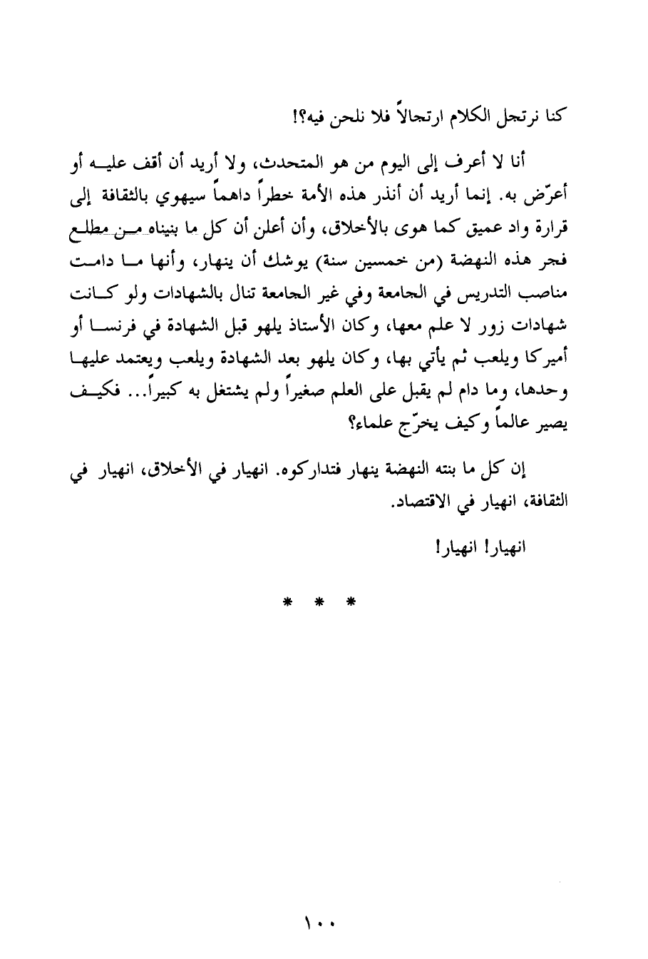 أنا لا أعرف إلى اليوم من هو المتحدث، ولا أريد أن أقف عليه أو أعرّض به. إنما أريد أن أنذر هذه الأمة خطراً داهماً سيهوي بالثقافة إلى قرارة واد عميق كما هوى بالأخلاق، وأن أعلن أن كل ما بنيناه من مطلع فجر هذه النهضة (من خمسين سنة) يوشك أن ينهار، وأنها ما دامت مناصب التدريس في الجامعة وفي غير الجامعة تنال بالشهادات ولو كانت شهادات زور لا علم معها، وكان الأستاذ يلهو قبل الشهادة في فرنسا أو أميركا ويلعب ثم يأتي بها، وكان يلهو بعد الشهادة ويلعب ويعتمد عليها وحدها، وما دام لم يقبل على العلم صغيراً ولم يشتغل به كبيراً .. فكيف يصير عالماً وكيف يخرّج علماء؟