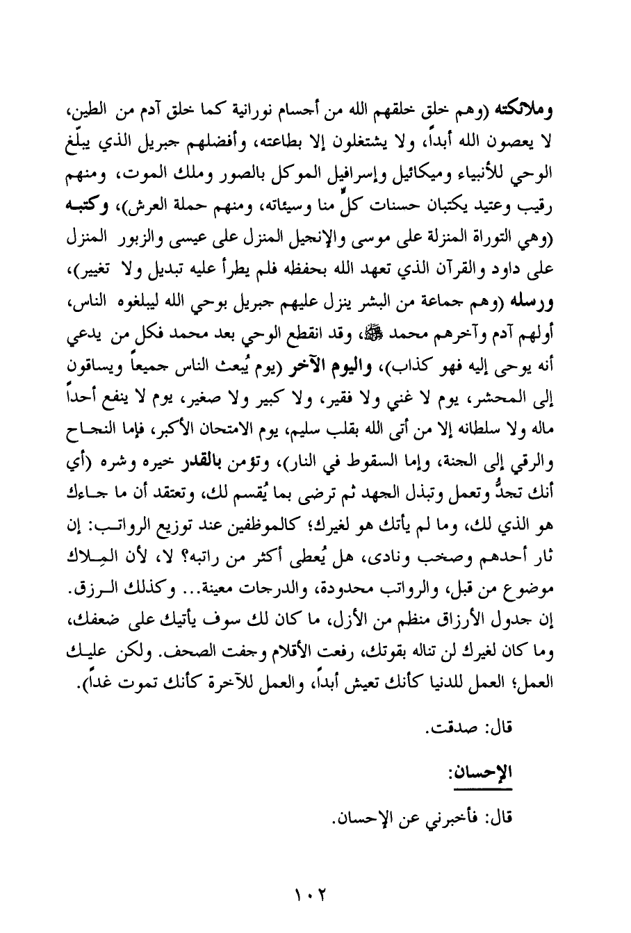 وملائكته (وهم خلق خلقهم الله من أجسام نورانية كما خلق آدم من الطين، لا يعصون الله أبداً، ولا يشتغلون إلا بطاعته، وأفضلهم جبريل الذي يبلّغ الوحي للأنبياء وميكائيل وإسرافيل الموكل بالصور وملك الموت، ومنهم رقيب وعتيد يكتبان حسنات كلٍّ منا وسيئاته، ومنهم حملة العرش)، وكتبه (وهي التوراة المنزلة على موسى والإنجيل المنزل على عيسى والزبور المنزل على داود والقرآن الذي تعهد الله بحفظه فلم يطرأ عليه تبديل ولا تغيير)، ورسله (وهم جماعة من البشر ينزل عليهم جبريل بوحي الله ليبلغوه الناس، أولهم آدم وآخرهم محمد صلى الله عليه وسلم، وقد انقطع الوحي بعد محمد فكل من يدعي أنه يوحى إليه فهو كذاب)، واليوم الآخر (يوم يُبعث الناس جميعاً ويساقون إلى المحشر، يوم لا غني ولا فقير، ولا كبير ولا صغير، يوم لا ينفع أحداً ماله ولا سلطانه إلا من أتى الله بقلب سليم، يوم الامتحان الأكبر، فإما النجاح والرقي إلى الجنة، وإما السقوط في النار)، وتؤمن بالقدر خيره وشره (أي أنك تجدُّ وتعمل وتبذل الجهد ثم ترضى بما يُقسم لك، وتعتقد أن ما جاءك هو الذي لك، وما لم يأتك هو لغيرك؛ كالموظفين عند توزيع الرواتب: إن ثار أحدهم وصخب ونادى، هل يُعطى أكثر من راتبه؟ لا، لأن المِلاك موضوع من قبل، والرواتب محدودة، والدرجات معينة ... وكذلك الرزق. إن جدول الأرزاق منظم من الأزل، ما كان لك سوف يأتيك على ضعفك، وما كان لغيرك لن تناله بقوتك، رفعت الأقلام وجفت الصحف. ولكن عليك العمل؛ العمل للدنيا كأنك تعيش أبداً، والعمل للآخرة كأنك تموت غداً).