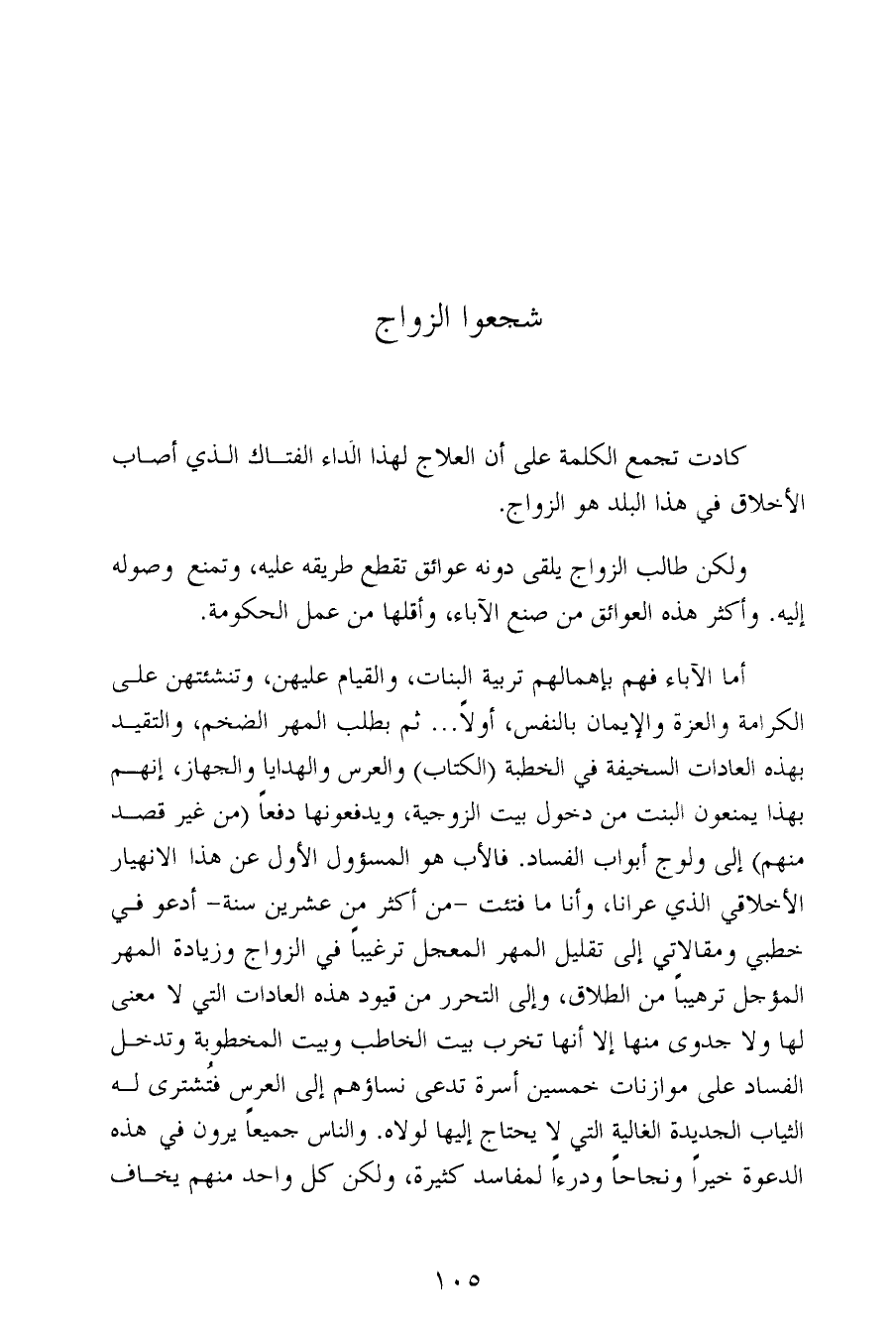 كادت تجمع الكلمة على أن العلاج لهذا الداء الفتاك الذي أصاب الأخلاف في هذا البلد هو الزواج.
