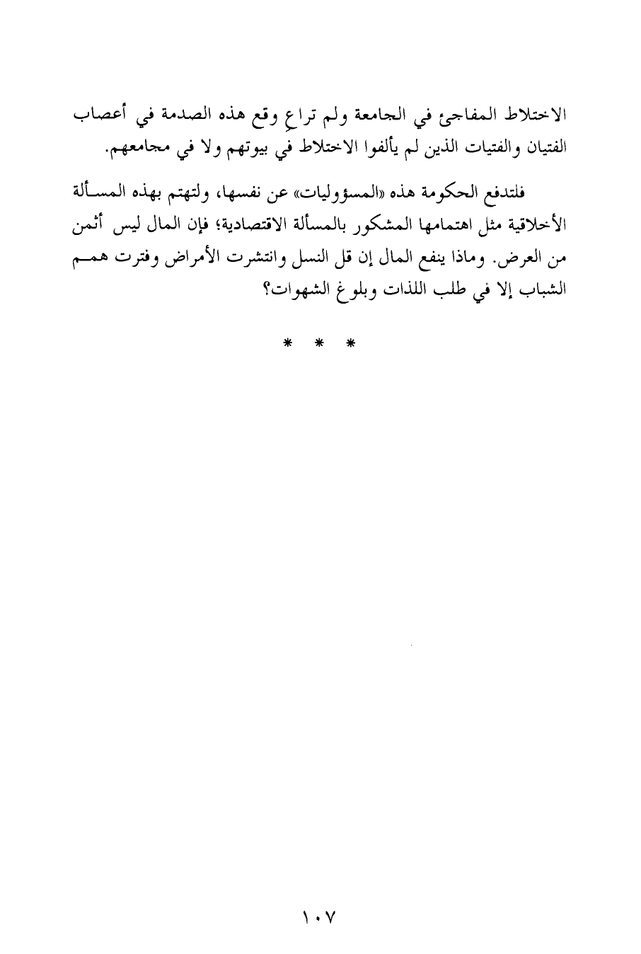 فلتدفع الحكومة هذه «المسؤوليات» عن نفسها، ولتهتم بهذه المسألة الأخلاقية مثل اهتمامها المشكور بالمسألة الاقتصادية؛ فإن المال ليس أثمن من العرض. وماذا ينفع المال إن قل النسل وانتشرت الأمراض وفترت همم الشباب إلا في طلب اللذات وبلوغ الشهوات؟