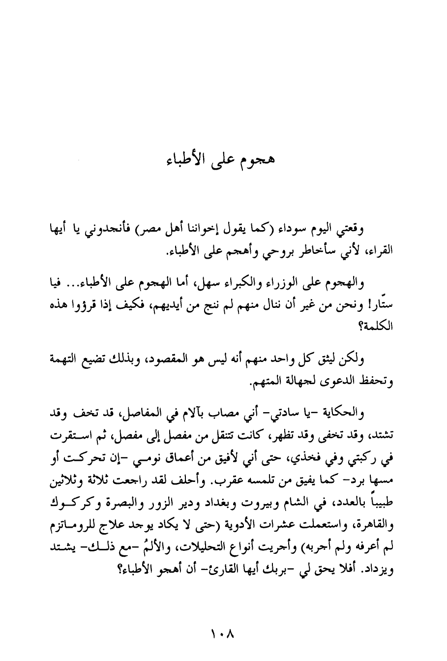 والهجوم على الوزراء والكبراء سهل، أما الهجوم على الأطباء ... فيا ستّار! ونحن من غير أن ننال منهم لم ننج من أيديهم، فكيف إذا قرؤوا هذه الكلمة؟