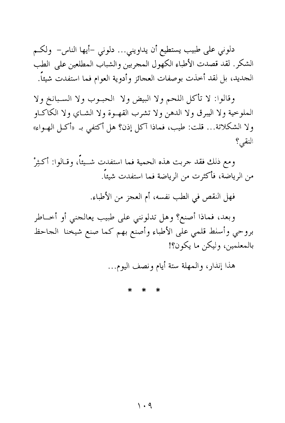 وبعد، فماذا أصنع؟ وهل تدلونني على طبيب يعالجني أو أخاطر بروحي وأسلط قلمي على الأطباء وأصنع بهم كما صنع شيخنا الجاحظ بالمعلمين، وليكن ما يكون؟!