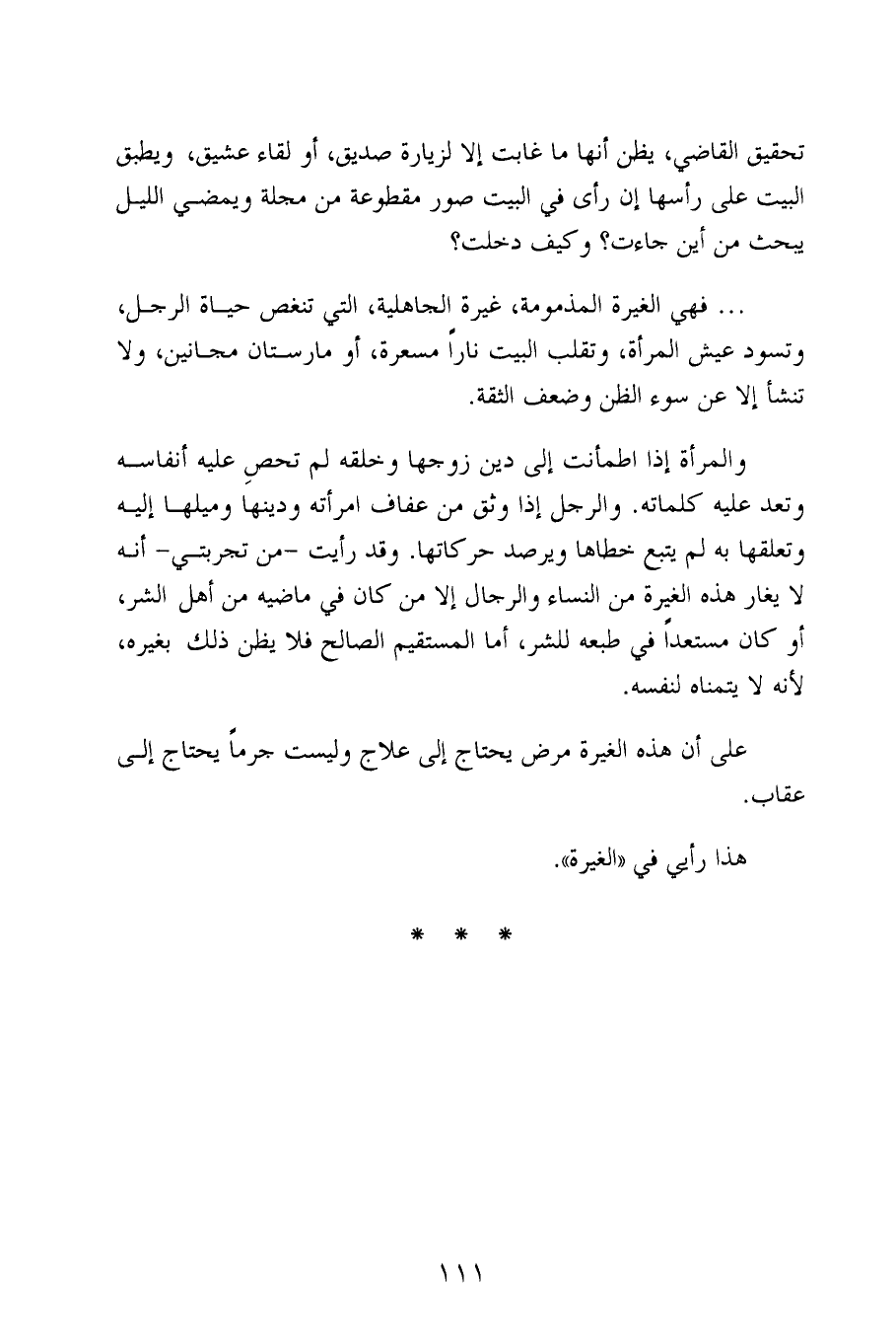 والمرأة إذا اطمأنت إلى دين زوجها وخلقه لم تحصِ عليه أنفاسه وتعد عليه كلماته. والرجل إذا وثق من عفاف امرأته ودينها وميلها إليه وتعلقها به لم يتبع خطاها ويرصد حركاتها. وقد رأيت -من تجربتي- أنه لا يغار هذه الغيرة من النساء والرجال إلا من كان في ماضيه من أهل الشر، أو كان مستعداً في طبعه للشر، أما المستقيم الصالح فلا يظن ذلك بغيره، لأنه لا يتمناه لنفسه.