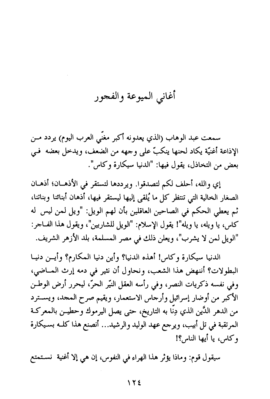 سمعت عبد الوهاب (الذي يعدونه أكبر مغنّي العرب اليوم) يردد من الإذاعة أغنيّة يكاد لحنها ينكبّ على وجهه من الضعف، ويدخل بعضه في بعض من التخاذل، يقول فيها: "الدنيا سيكارة وكاس".