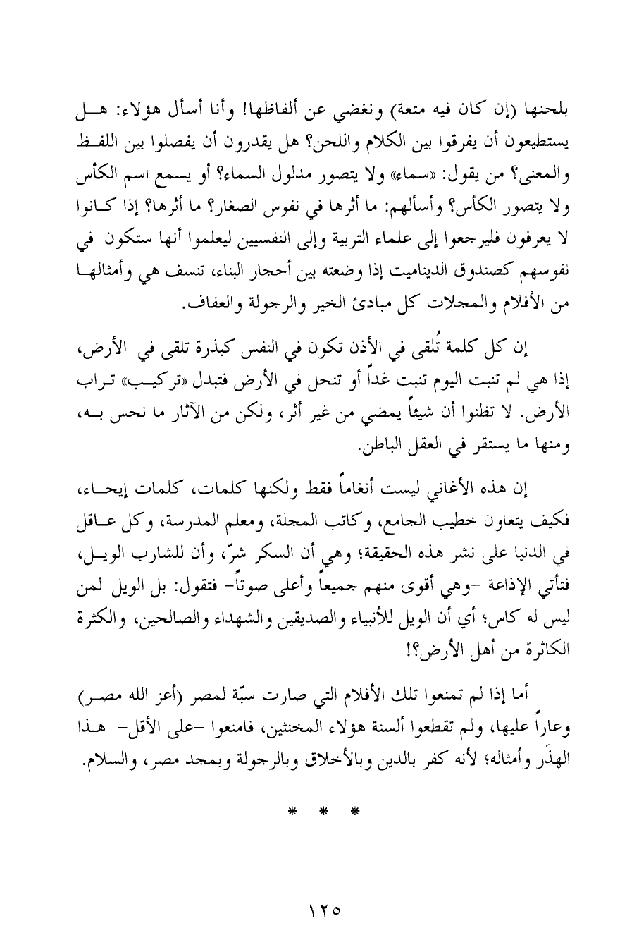 أما إذا لم تمنعوا تلك الأفلام التي صارت سبّة لمصر (أعز الله مصر) وعاراً عليها، ولم تقطعوا ألسنة هؤلاء المخنثين، فامنعوا -على الأقل- هذا الهذَر وأمثاله؛ لأنه كفر بالدين وبالأخلاق وبالرجولة وبمجد مصر، والسلام.