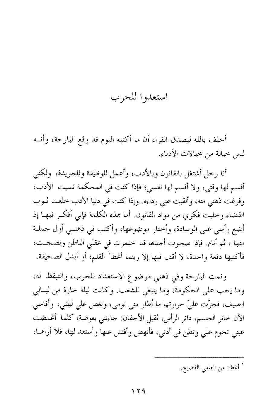 ونمت البارحة وفي ذهني موضوع الاستعداد للحرب، والتيقظ له، وما يجب على الحكومة، وما ينبغي للشعب. وكانت ليلة حارة من ليالي الصيف، فجرّت عليّ حرارتها ما أطار مني نومي، ونغص علي ليلتي، وأقامني الآن خائر الجسم، دائر الرأس، ثقيل الأجفان: جاءتني بعوضة، كلما أغمضت عيني تحوم علي وتطن في أذني، فأنهض وأفتش عنها وأستعد لها، فلا أراها،