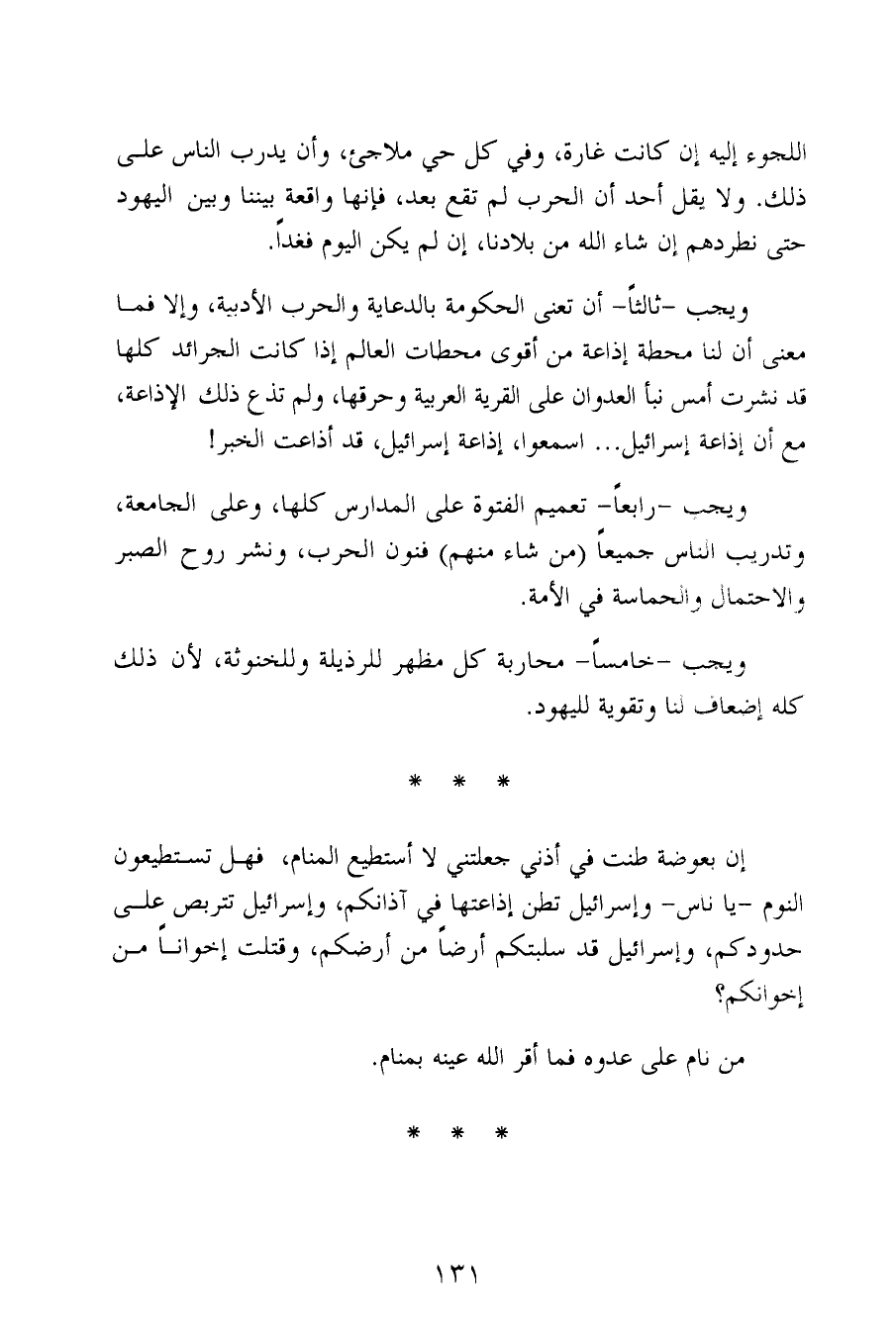 اللجوء إليه إن كانت غارة، وفي كل حي ملاجئ، وأن يدرب الناس على ذلك. ولا يقل أحد أن الحرب لم تقع بعد، فإنها واقعة بيننا وبين اليهود حتى نطردهم إن شاء الله من بلادنا، إن لم يكن اليوم فغداً.