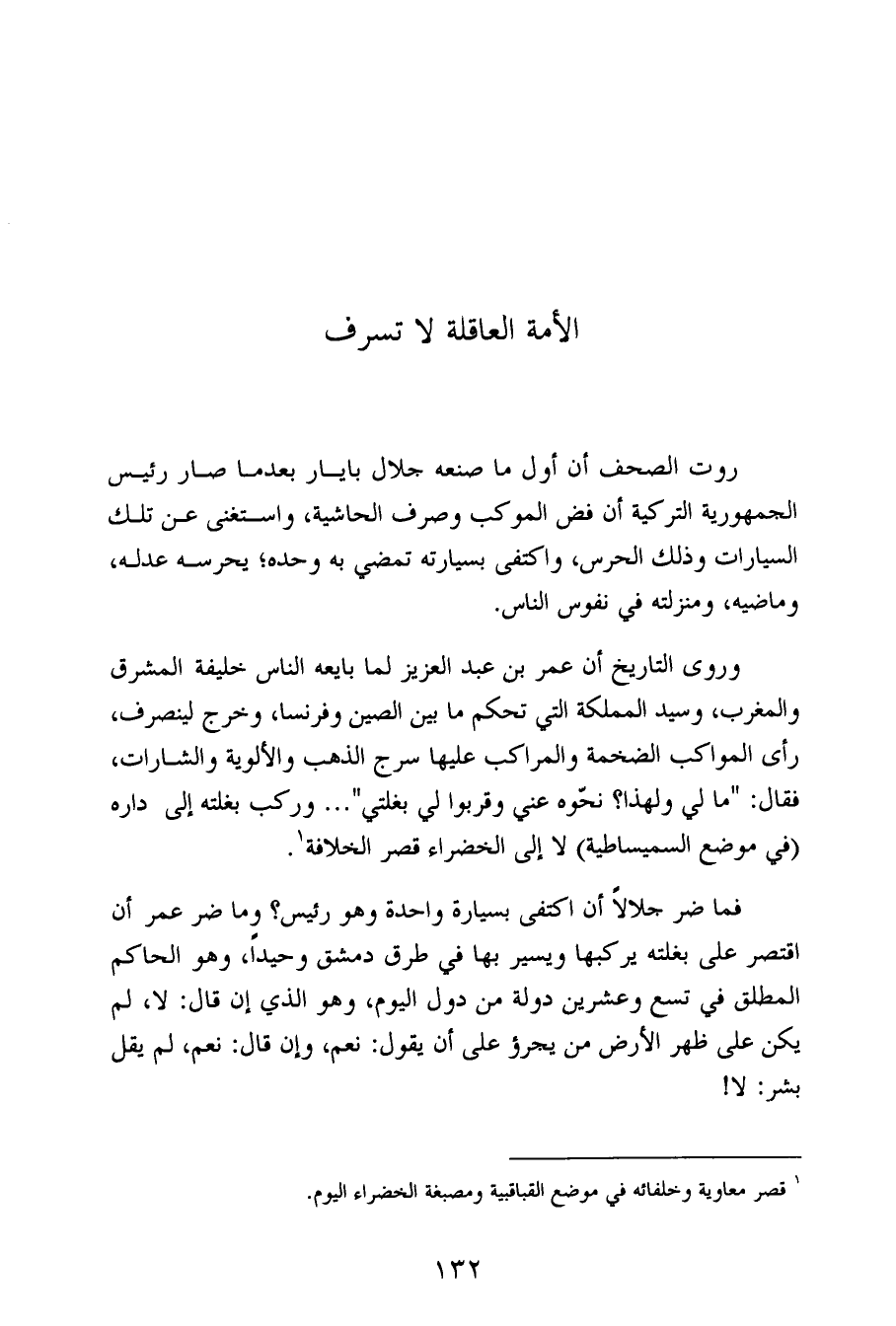 فما ضر جلالاً أن اكتفى بسيارة واحدة وهو رئيس؟ وما ضر عمر أن اقتصر على بغلته يركبها ويسير بها في طرق دمشق وحيداً، وهو الحاكم المطلق في تسع وعشرين دولة من دول اليوم، وهو الذي إن قال: لا، لم يكن على ظهر الأرض من يجرؤ على أن يقول: نعم، وإن قال: نعم، لم يقل بشر: لا!