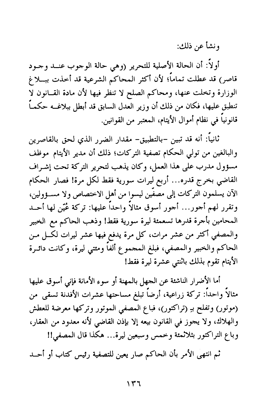 ثانياً: أنه قد تبين -بالتطبيق- مقدار الضرر الذي لحق بالقاصرين والبالغين من تولي الحكام تصفية التركات؛ ذلك أن مدير الأيتام موظف مسؤول مدرب على هذا العمل، وكان يذهب لتحرير التركة تحت إشراف القاضي بخرج قدره ... أربع ليرات سورية فقط لكل مرة! فصار الحكام الآن يسلمون التركات إلى مصفّين ليسوا من أهل الاختصاص ولا مسؤولين، وتقرر لهم أجور ... أجور أسوق مثالاً واحداً عليها: تركة عُيّن لها أحد المحامين بأجرة قدرها تسعمئة ليرة سورية فقط! وذهب الحاكم مع الخبير والمصفي أكثر من عشر مرات، كل مرة يدفع فيها عشر ليرات لكل من الحاكم والخبير والمصفي، فبلغ المجموع ألفاً ومئتي ليرة، وكانت دائرة الأيتام تقوم بذلك باثنتي عشرة ليرة فقط!