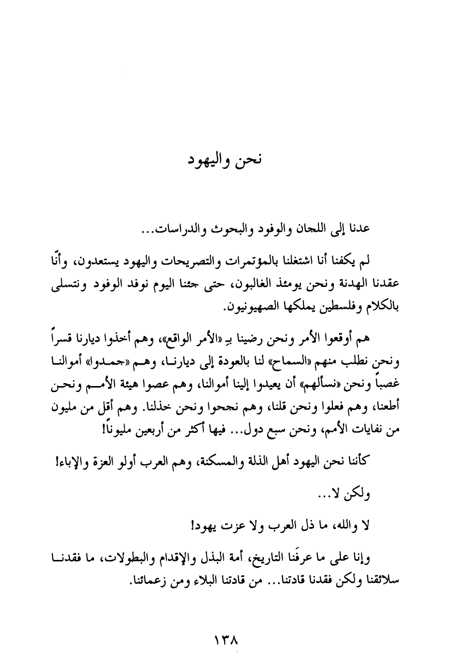 هم أوقعوا الأمر ونحن رضينا بِـ «الأمر الواقع»، وهم أخذوا ديارنا قسراً ونحن نطلب منهم «السماح» لنا بالعودة إلى ديارنا، وهم «جمدوا» أموالنا غصباً ونحن «نسألهم» أن يعيدوا إلينا أموالنا، وهم عصوا هيئة الأمم ونحن أطعنا، وهم فعلوا ونحن قلنا، وهم نجحوا ونحن خذلنا. وهم أقل من مليون من نفايات الأمم، ونحن سبع دول ... فيها أكثر من أربعين مليوناً!