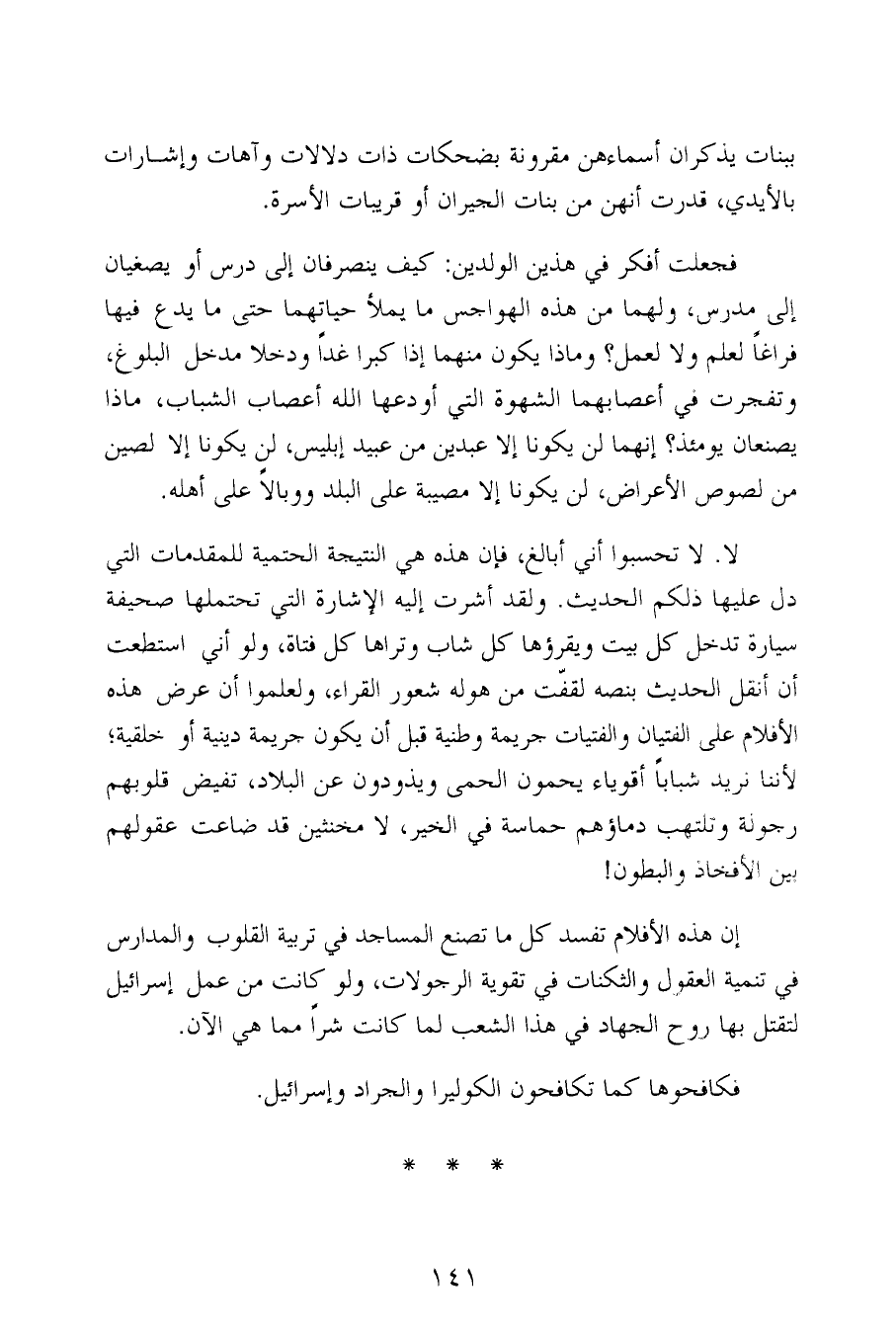 إن هذه الأفلام تفسد كل ما تصنع المساجد في تربية القلوب والمدارس في تنمية العقول والثكنات في تقوية الرجولات، ولو كانت من عمل إسرائيل لتقتل بها روح الجهاد في هذا الشعب لما كانت شراً مما هي الآن.