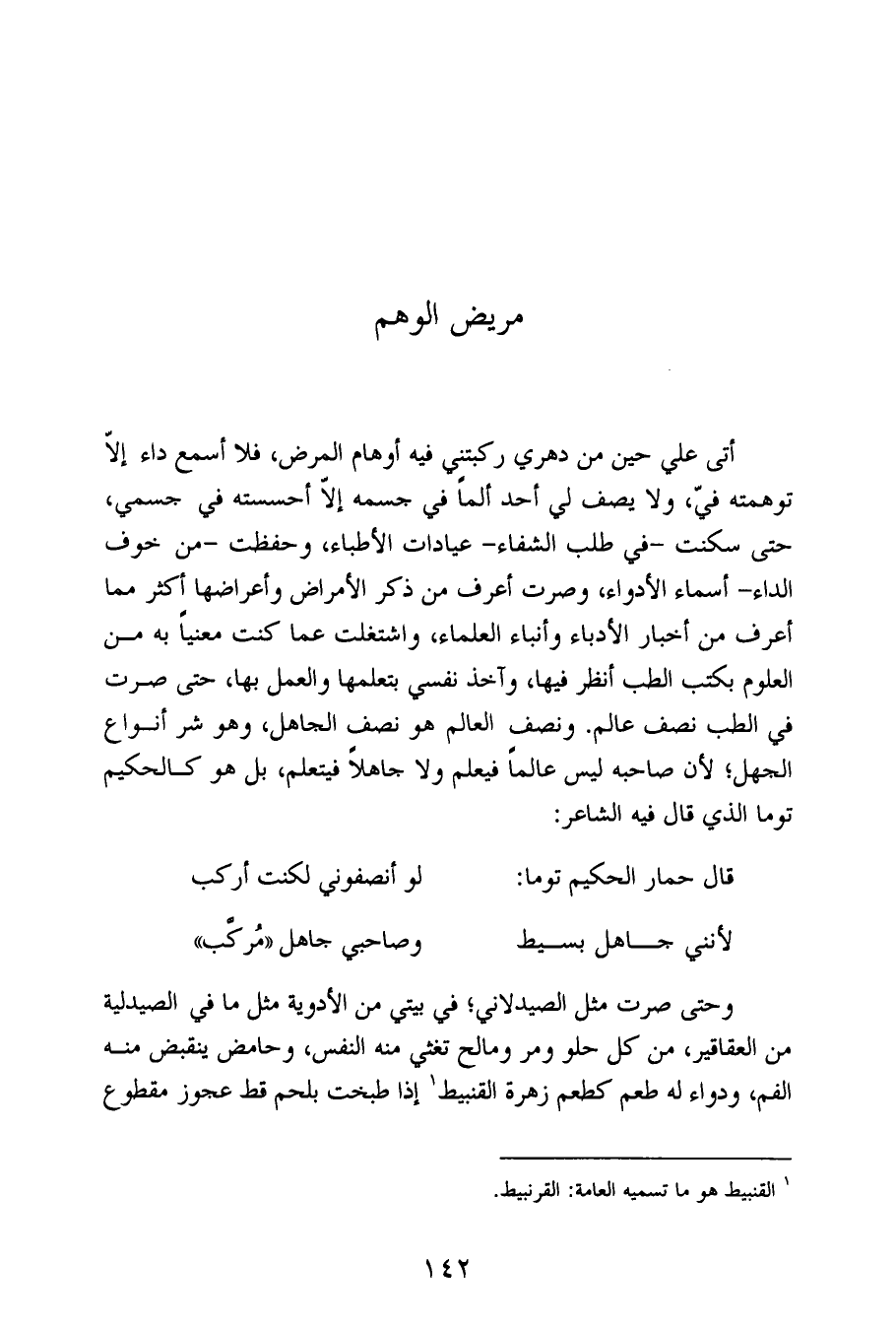 أتى علي حين من دهري ركبتني فيه أوهام المرض، فلا أسمع داء إلّا توهمته فيّ، ولا يصف لي أحد ألماً في جسمه إلّا أحسسته في جسمي، حتى سكنت -في طلب الشفاء- عيادات الأطباء، وحفظت -من خوف الداء- أسماء الأدواء، وصرت أعرف من ذكر الأمراض وأعراضها أكثر مما أعرف من أخبار الأدباء وأنباء العلماء، واشتغلت عما كنت معنياً به من العلوم بكتب الطب أنظر فيها، وآخذ نفسي بتعلمها والعمل بها، حتى صرت في الطب نصف عالم. ونصف العالم هو نصف الجاهل، وهو شر أنواع الجهل؛ لأن صاحبه ليس عالماً فيعلم ولا جاهلاً فيتعلم، بل هو كالحكيم توما الذي قال فيه الشاعر: