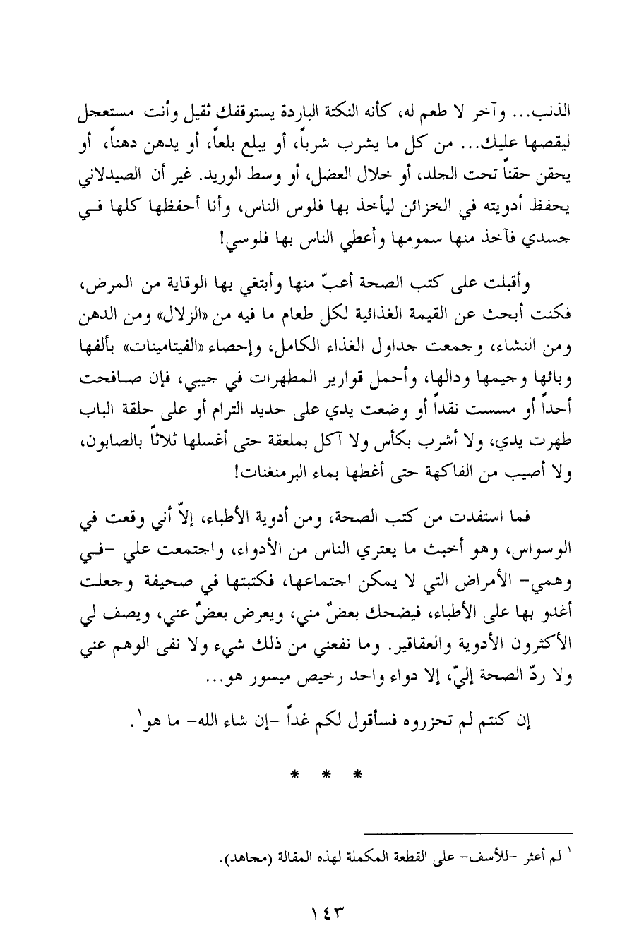 فما استفدت من كتب الصحة، ومن أدوية الأطباء، إلّا أني وقعت في الوسواس، وهو أخبث ما يعتري الناس من الأدواء، واجتمعت علي -في وهمي- الأمراض التي لا يمكن اجتماعها، فكتبتها في صحيفة وجعلت أغدو بها على الأطباء، فيضحك بعضٌ مني، ويعرض بعضٌ عني، ويصف لي الأكثرون الأدوية والعقاقير. وما نفعني من ذلك شيء ولا نفى الوهم عني ولا ردّ الصحة إليّ، إلا دواء واحد رخيص ميسور هو ...
