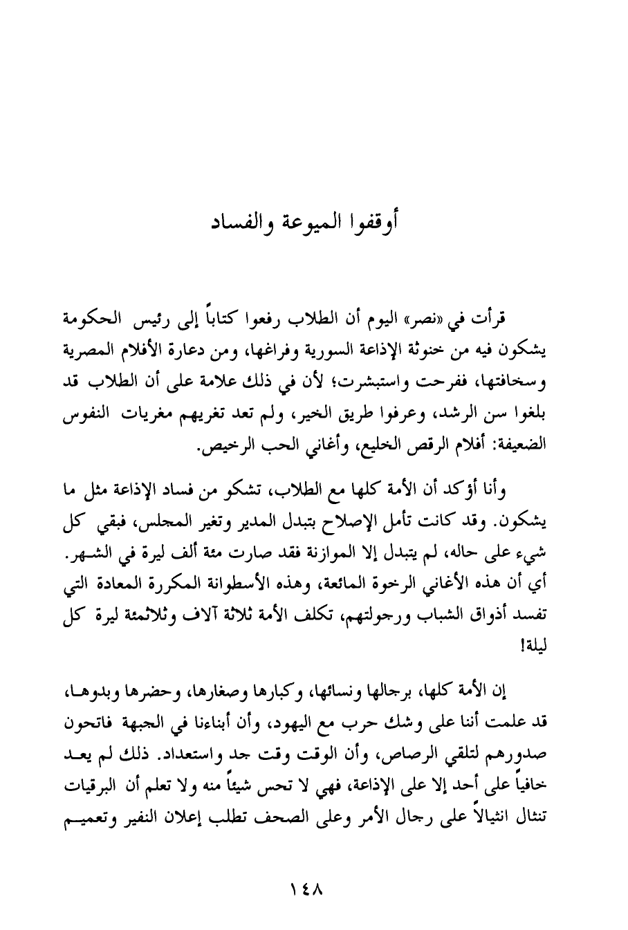 قرأت في «نصر» اليوم أن الطلاب رفعوا كتاباً إلى رئيس الحكومة يشكون فيه من خنوثة الإذاعة السورية وفراغها، ومن دعارة الأفلام المصرية وسخافتها، ففرحت واستبشرت؛ لأن في ذلك علامة على أن الطلاب قد بلغوا سن الرشد، وعرفوا طريق الخير، ولم تعد تغريهم مغريات النفوس الضعيفة: أفلام الرقص الخليع، وأغاني الحب الرخيص.