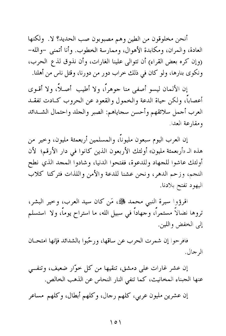 إن الألمان ليسو أصفى منا جوهراً، ولا أطيب أصلاً، ولا أقوى أعصاباً، ولكن حياة الدعة والخمول والقعود عن الحروب كادت تفقد العرب أجمل سلائقهم وأحسن سجاياهم: الصبر والجلد واحتمال الشدائد ومقارعة العدا.