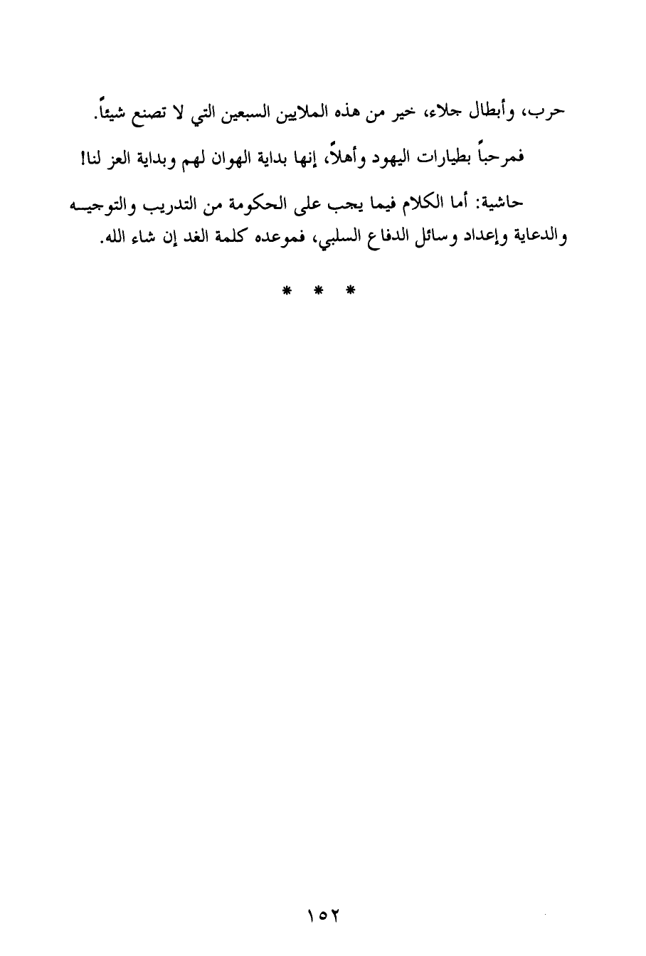 حاشية: أما الكلام فيما يجب على الحكومة من التدريب والتوجيه والدعاية وإعداد وسائل الدفاع السلبي، فموعده كلمة الغد إن شاء الله.
